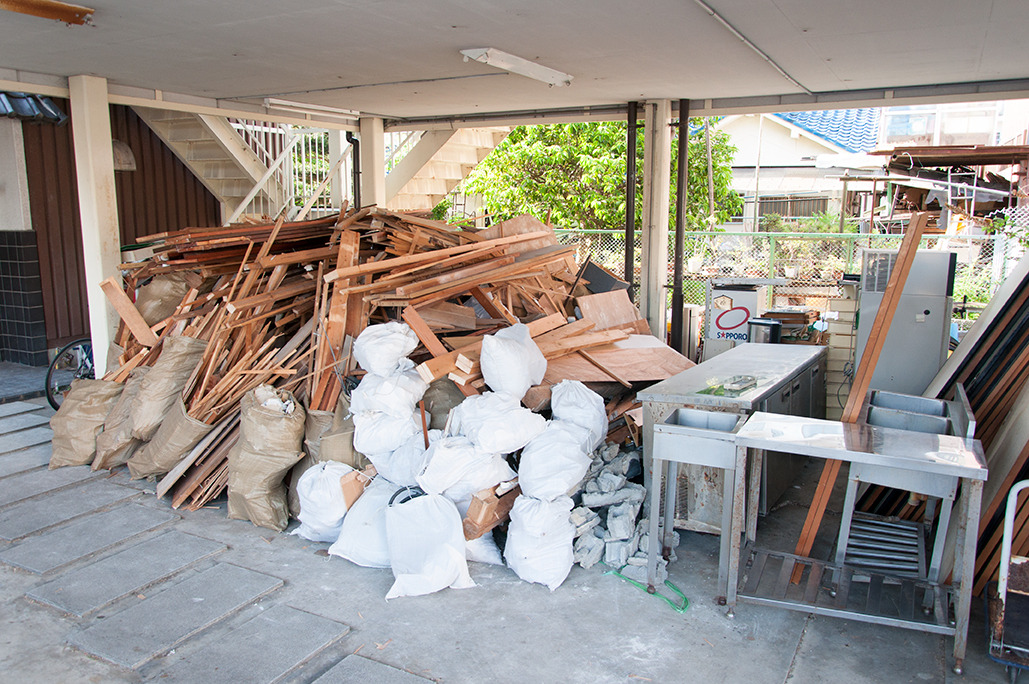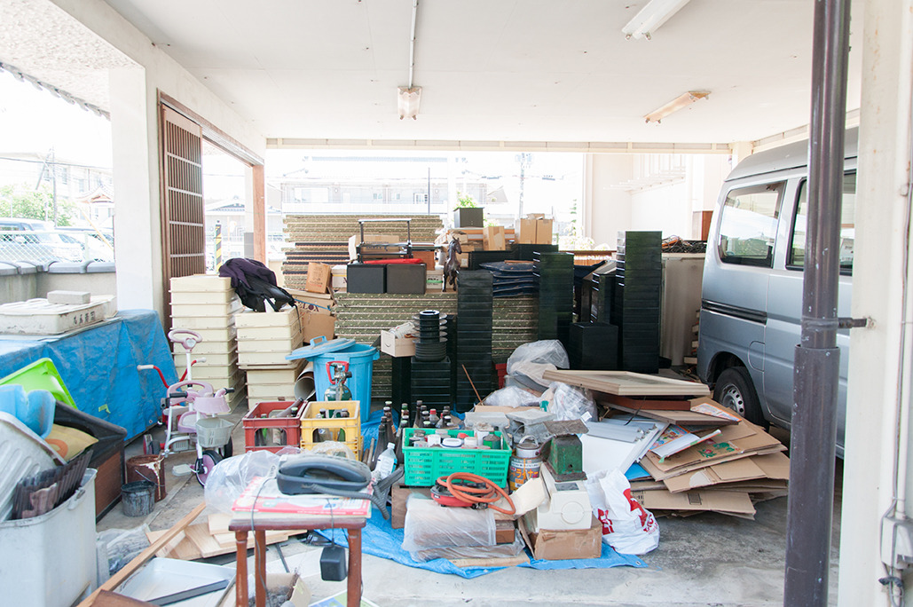 畳をはがし、テーブル、冷蔵庫や大量の座布団を下の駐車場まで運び出します。駐車場が物で埋まったところで、廃品回収の業者さんが荷物を大型トラックにパンパン詰め込んで引き取ってくれました。物がなくなってスッキリ。