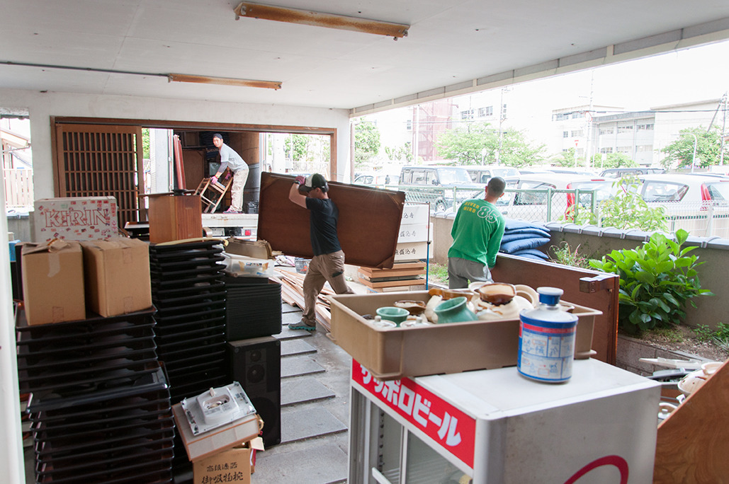 その間に、2Fのスペースを大掃除。1~2Fまでの小さなエレベーターの中からも食器が見つかったり、もう駐車場をはみ出しそうな廃棄物にドキドキします。