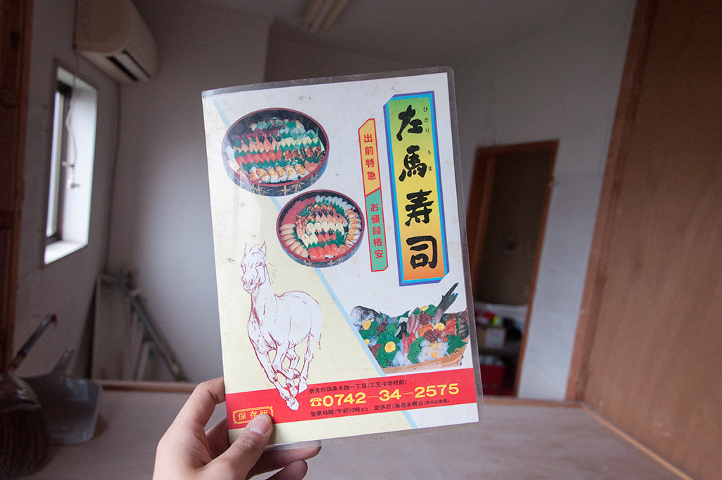 作業中、大きな靴箱を動かすと、元お寿司屋さんのメニューが出てきました。見ると、いままで店名の「左馬寿司」を「さうま(もしくは)さますし」と読んでいたのですが、どうやら「ひだりうますし」と、オール訓読みであることが判明し、静かにどよめきました。
