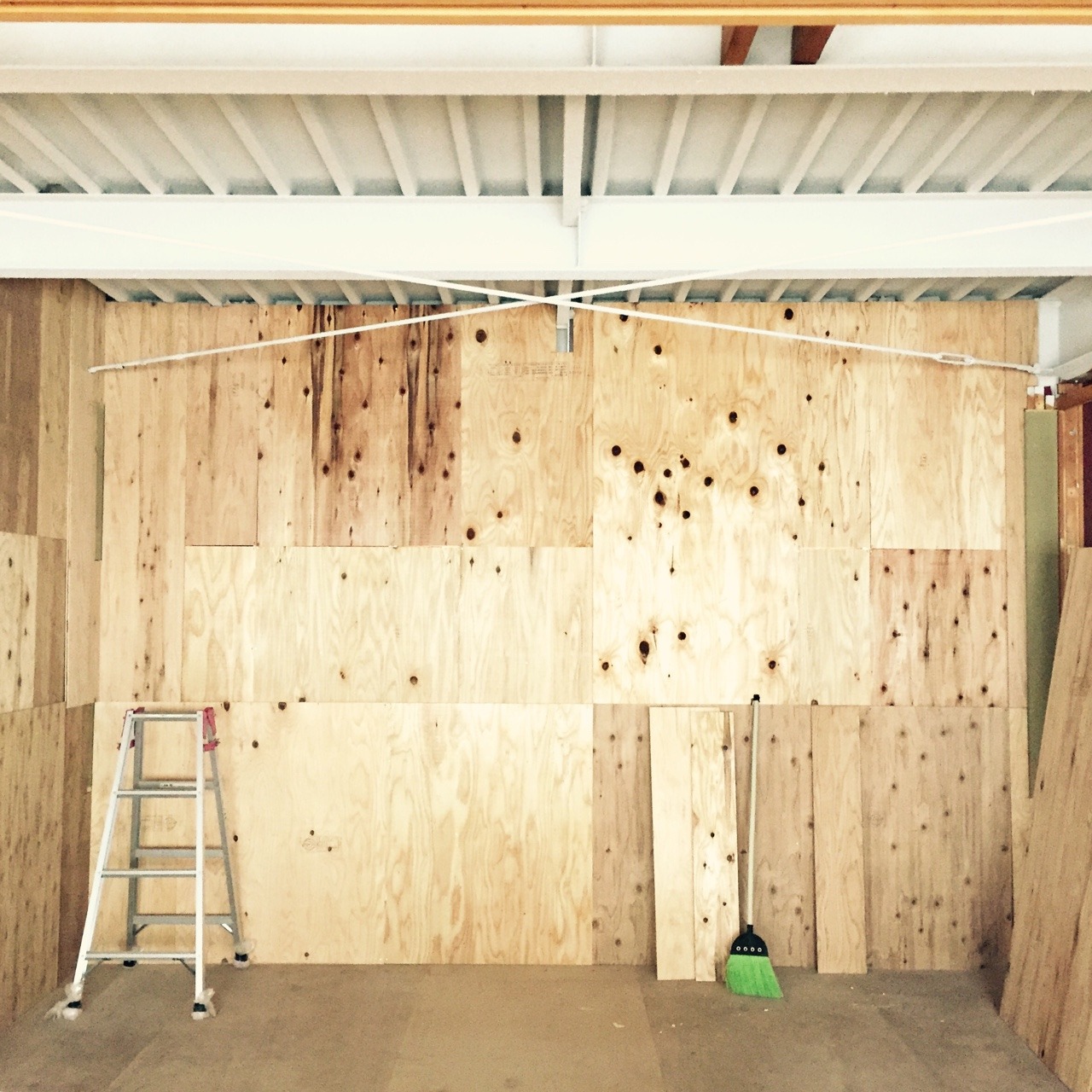 いよいよ壁の「面」の部分をバッタンバッタンと貼り付けてゆきます。大きなパズルを当てはめていくように隙間なくピタッとはまると妙な満足感。面倒ですがコンパネは二重張りで一枚目と目地をずらして二枚目を張っていきます。丈夫な壁になりますように。