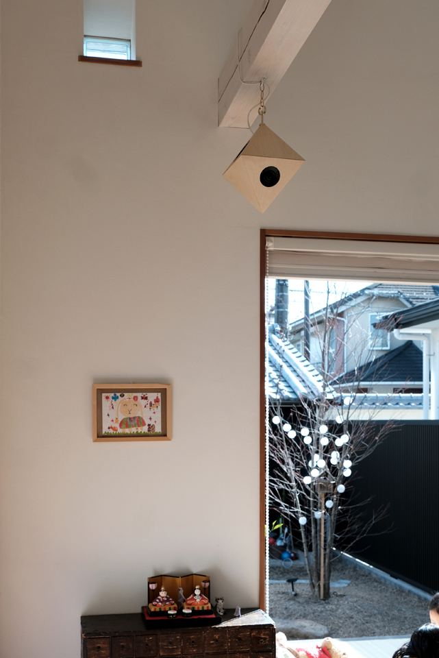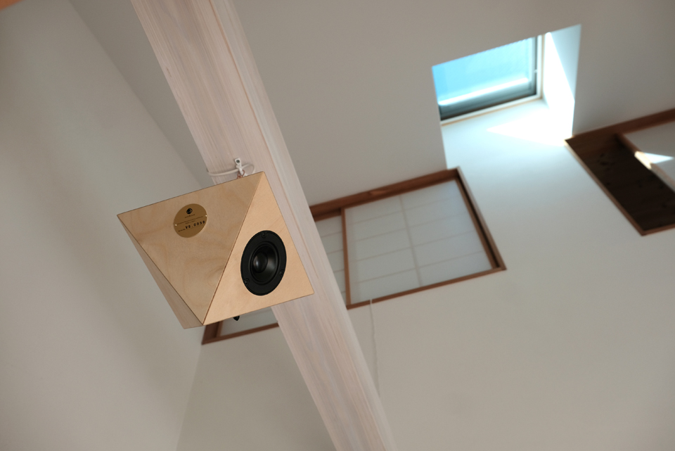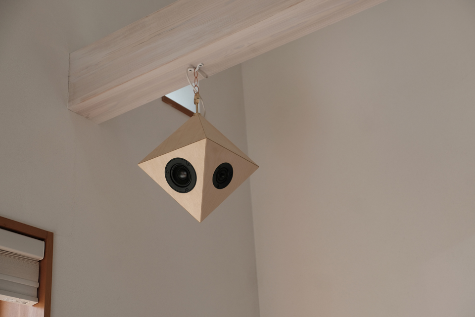 奈良の住宅A邸に8面体スピーカー”vision“を納入いたしました。一軒家のLDK、開放感のある吹き抜けに通る二本の梁に一台ずつを吊り下げました。まるでスピーカーが下げられるのを待っていたかのように、白い空間にバーチの白木が馴染みます。
