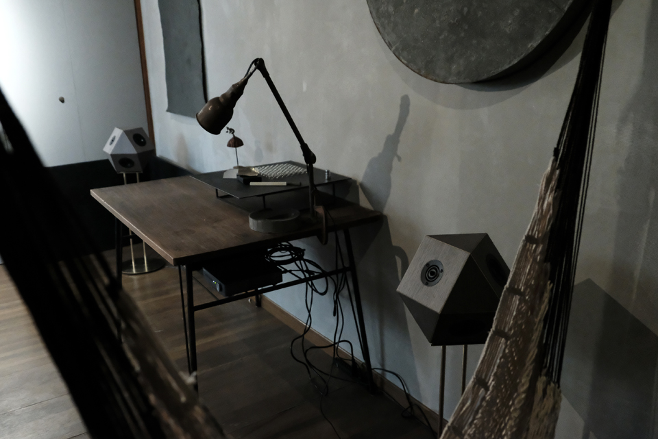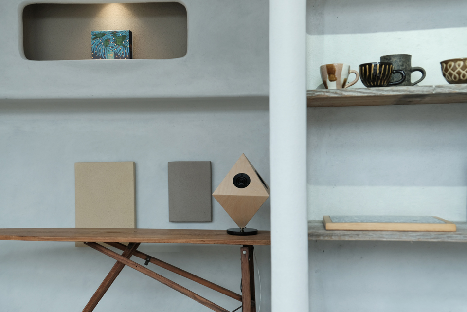 元電気屋を改装したモダンで可愛らしい空間「ヨコギャラリー」には8面体スピーカー”vision“を設置。アールのついた左官仕上げとエッジのきいた”vision”のデザインが対照的。スピーカーは展示に合わせてフレキシブルに動かせるようにと、専用台座での使用です。