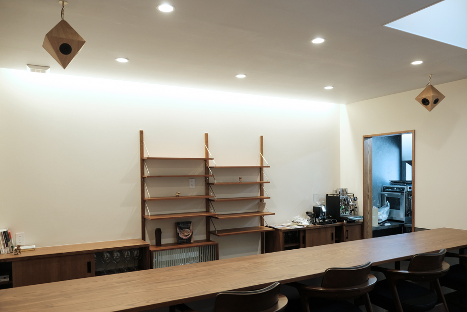 広々としたカウンターの両サイドに吊り下げられたスピーカーは、店主側にも同じように響きます。客と同じ音を聴き、音源や音量を微調整できるのも嬉しい。