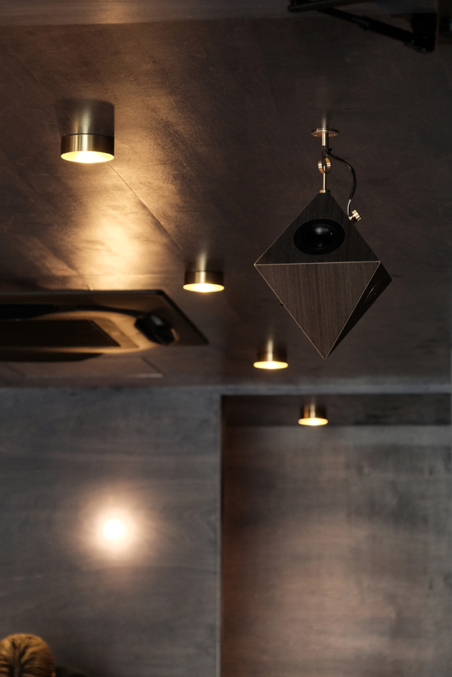 sonihouseのスピーカーは2台で1セット。空間の使い方に合わせ、一台は入り口付近に吊り、もう一台は奥のカウンターに置いて設置することに。
