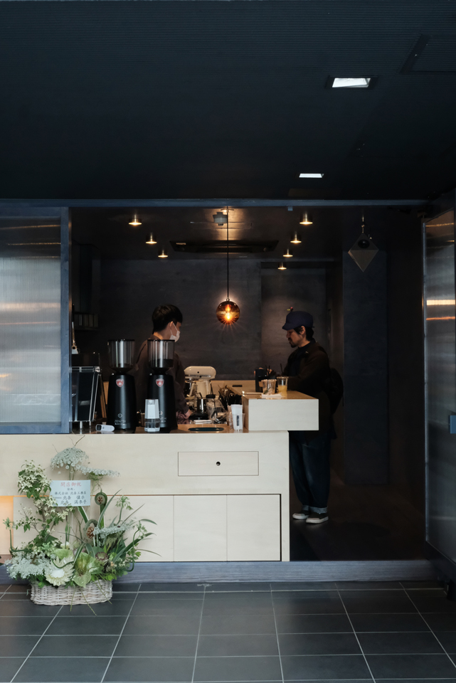 設計はMIRRORの田中了多さん。何重にも藍染を施した絶妙な壁色に、新色コトグレー仕上げの淡さがシックに馴染みます。珈琲豆をイメージして作られたNEW LIGHT POTTERYによるペンダントライトとも相性バッチリ。
