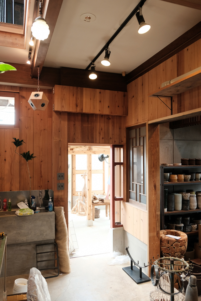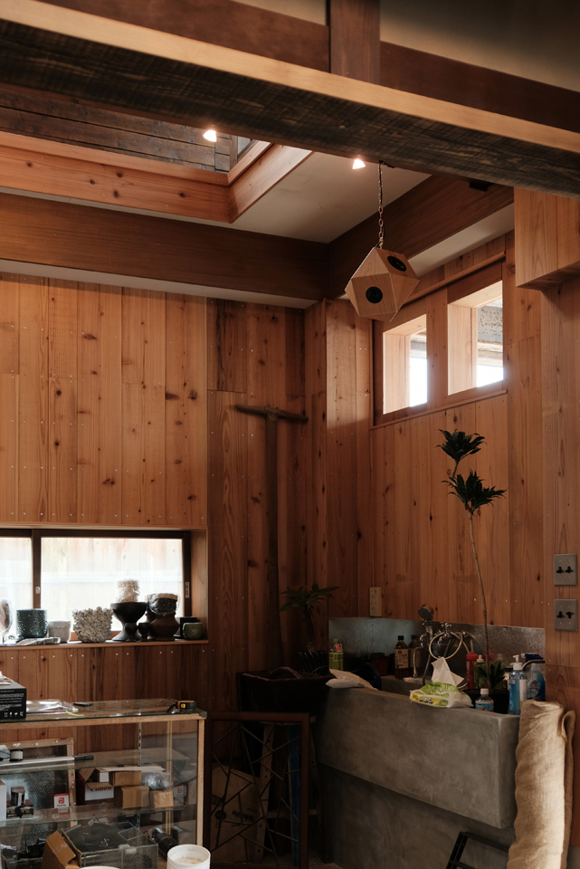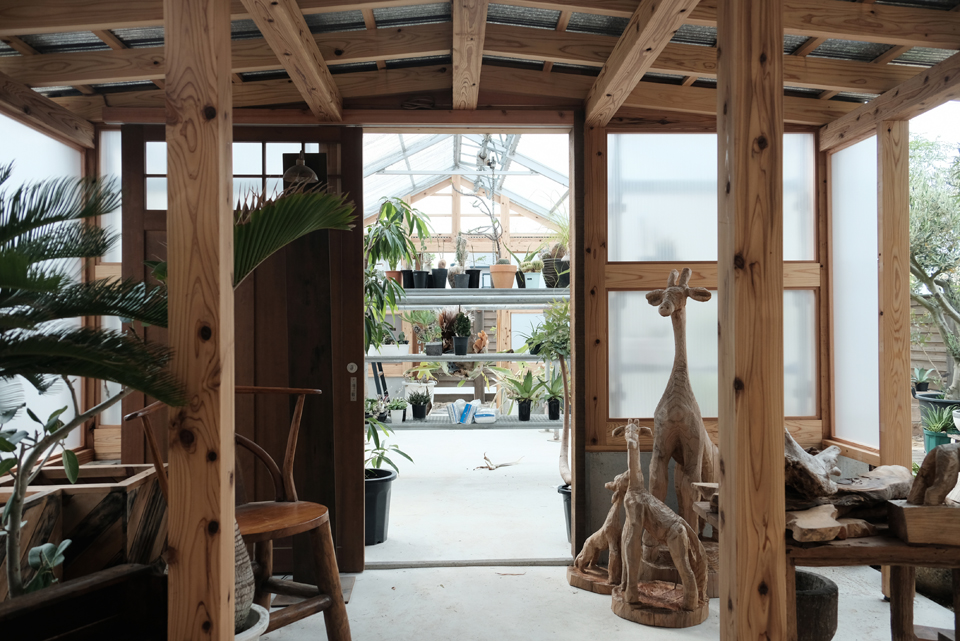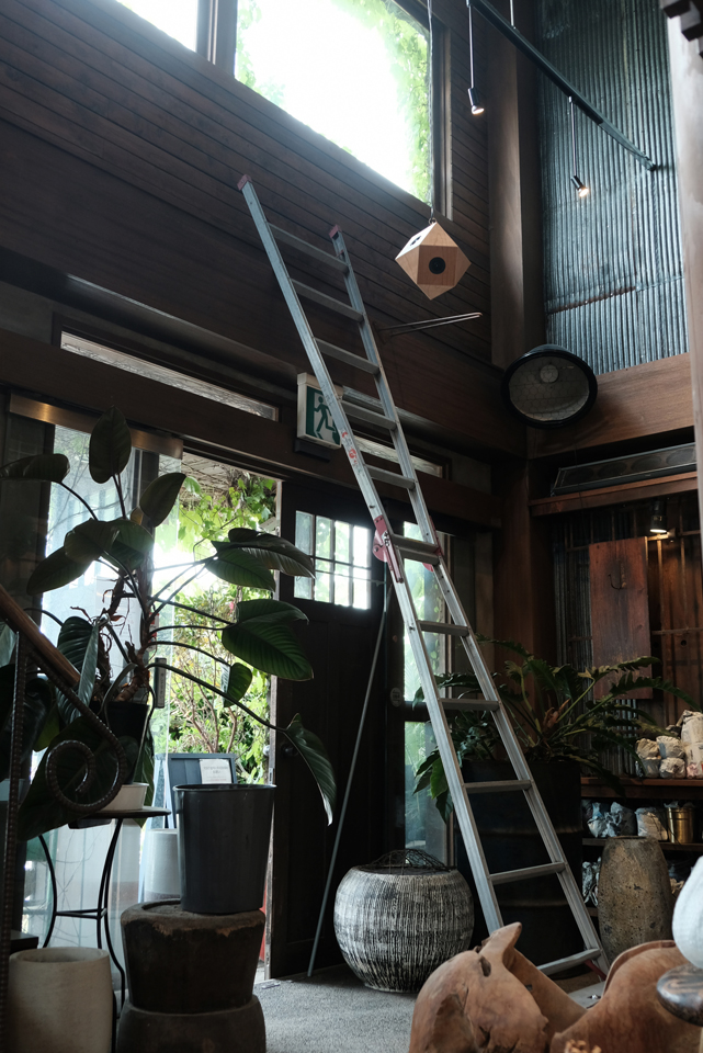 観葉植物や多肉植物、陶器鉢などが所狭しと並ぶ賑やかな店内。片方はかなり高い吹き抜けの真ん中、宙に浮かぶよう吊り下げました。ちょうどリニューアルオープンの準備中にお邪魔したこの日、脚立を置いたままの写真で失礼。