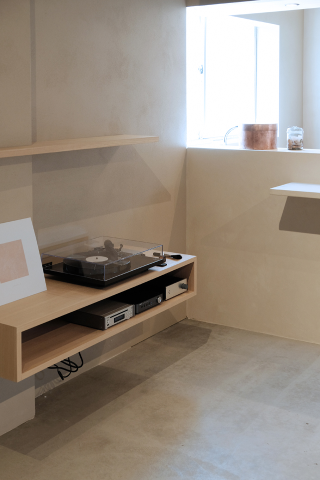 約120平米の広さがありますが、”scenery”1セット(2台)でも十分に音がまわります。スピーカーの樹種はナチュラルな風合いのホワイトオークですが、ミストグレーの内装に浮かぶとシャープさも感じます。