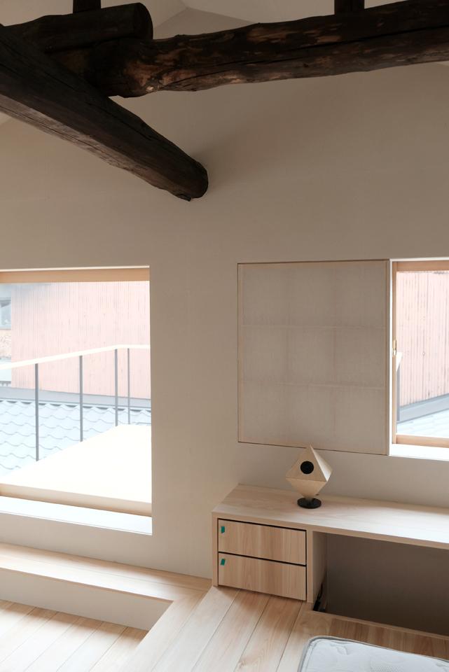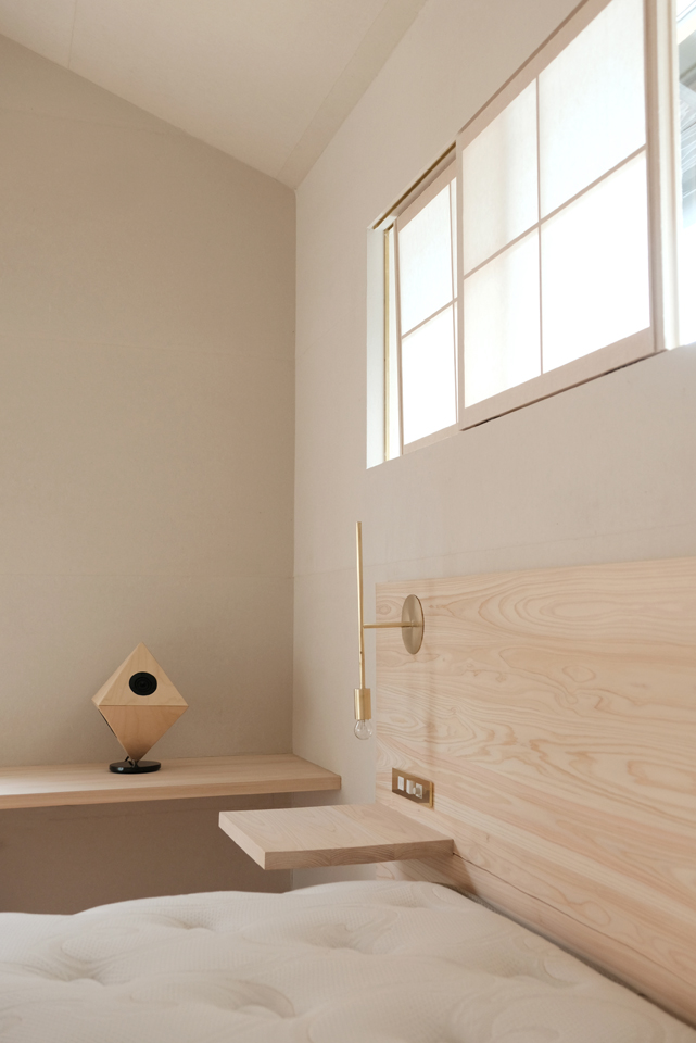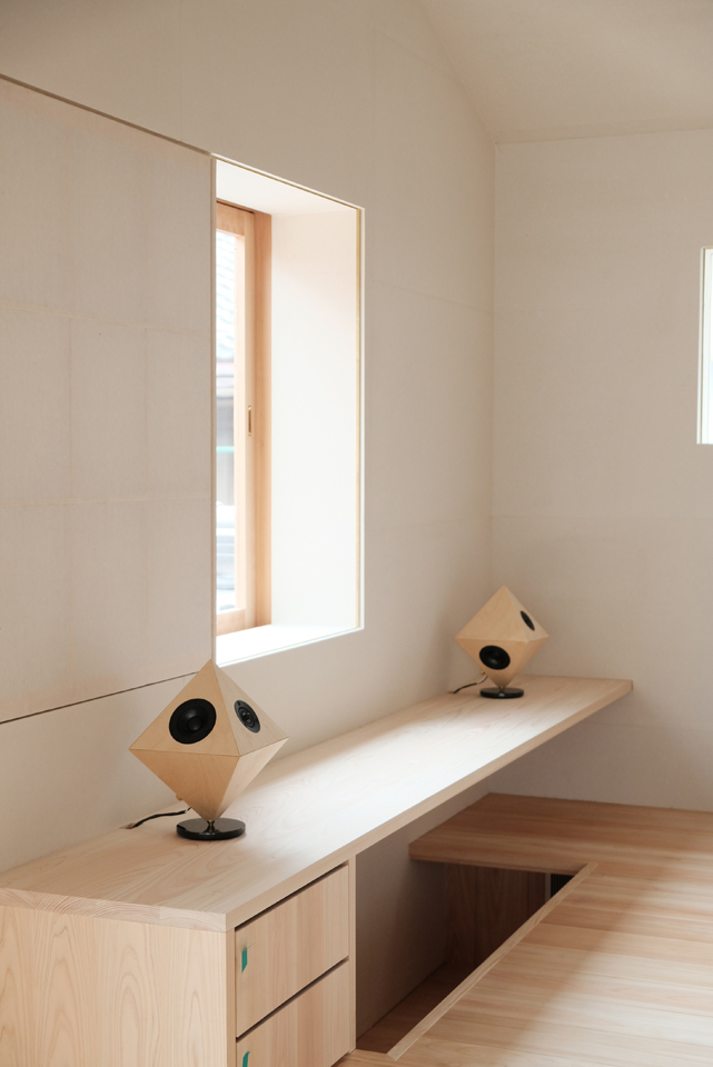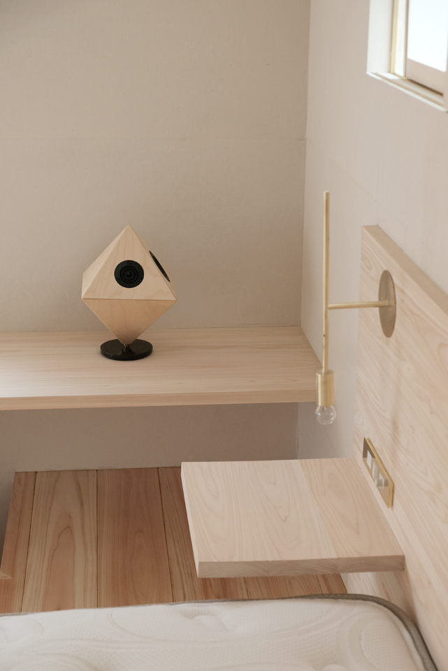 “vision”を設置した寝室は、和紙貼りされた壁面と天井高のおかげもあり、バランスよく音が響きます。小さい音量でも細部まで聴こえ、音楽を聴きながら心地よく眠りにつけそうです。光を暖かく反射した白い内装にバーチ仕上げがピッタリはまります。