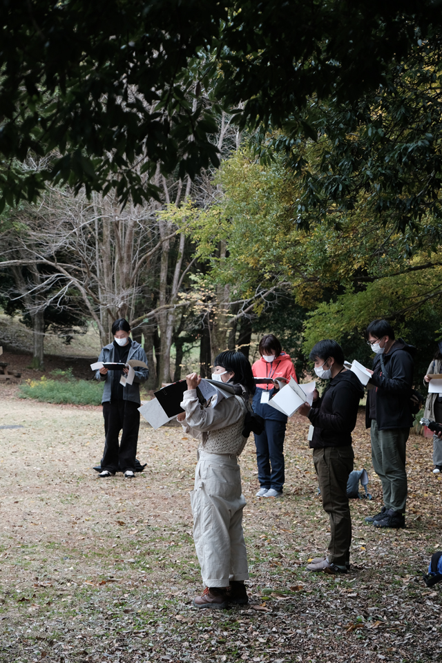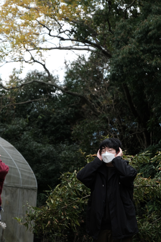 耳をひらく体操を行ったあとは、耳に手を当て歩き回ってみます。風の音、落ち葉を踏みしめる音、どんぐりが落ちる音、遠くで走るバイクの音。心の赴くままに自分の好きな場所を見つけて彷徨います。