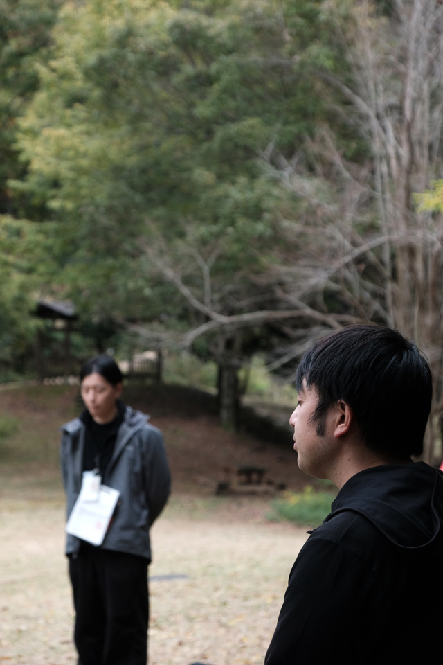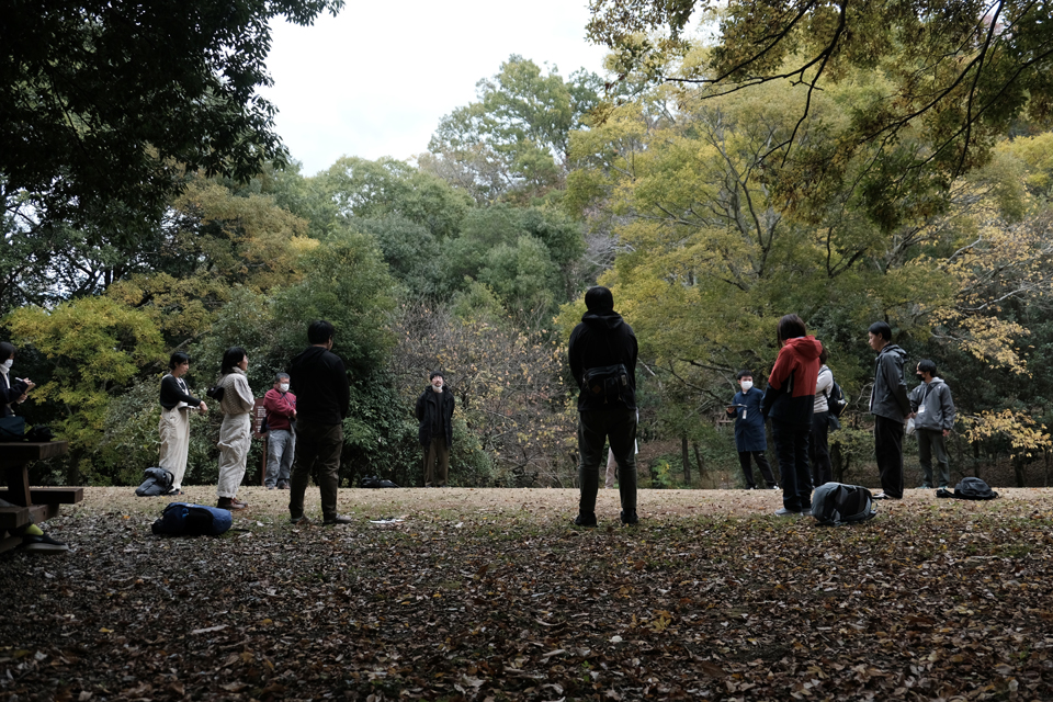 参加者が甘樫丘豊浦休憩所に集合。ツアーのガイドを務める岩田茉莉江よりイントロダクション。地奏の主旨とツアーで使用するしおりの使い方を解説。