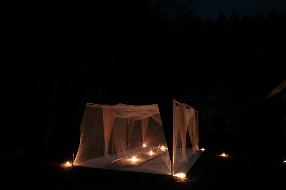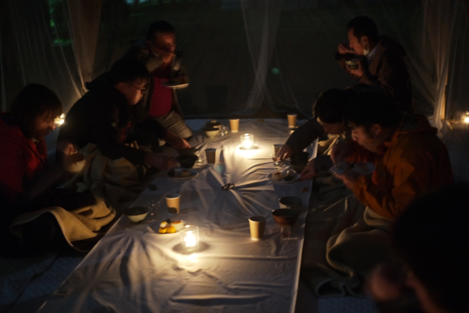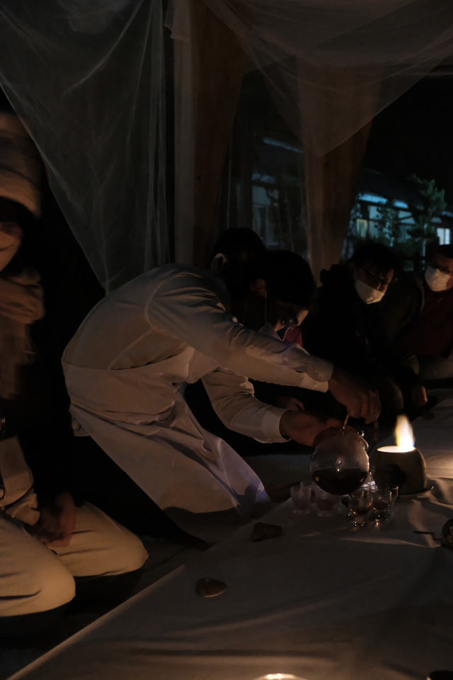 「地奏」の食事を担当するpurjeの高橋氏によってお茶が入れられ、夕食のスタート。しかしこの会場、灯りがなくほとんど手元が見えず、さらにはカトラリーも見当たりません。