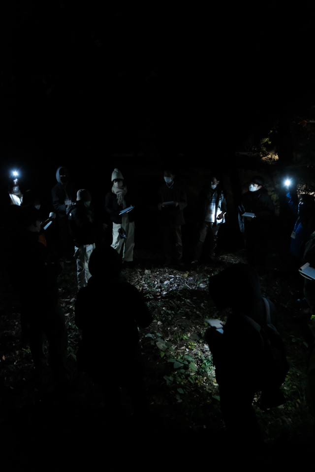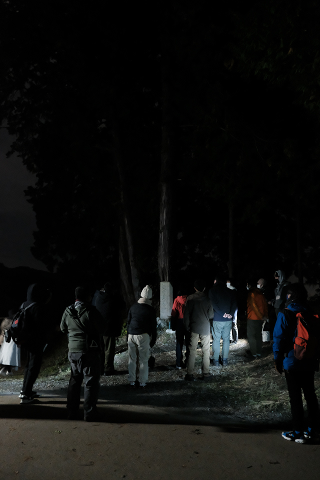 食後は、宿坊からほど近い大伴夫人之墓へ。さらにここで、暗闇で音を聴くワークです。夕方に行ったワークと同じく、自分を中心として音を分類し記述していきます。時間が変われば虫や鳥の声も全然違います。