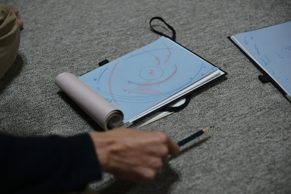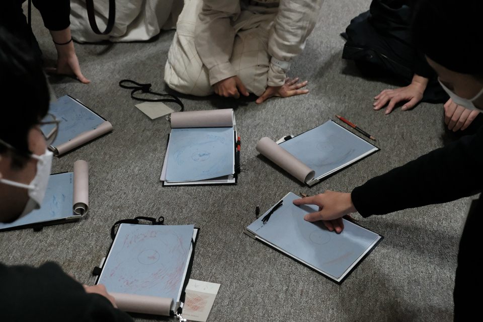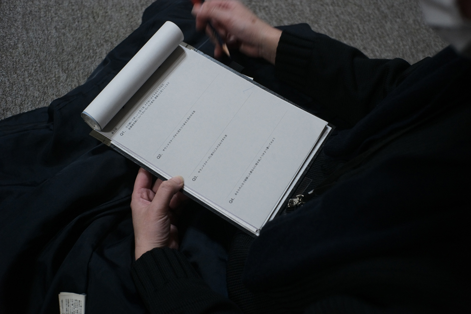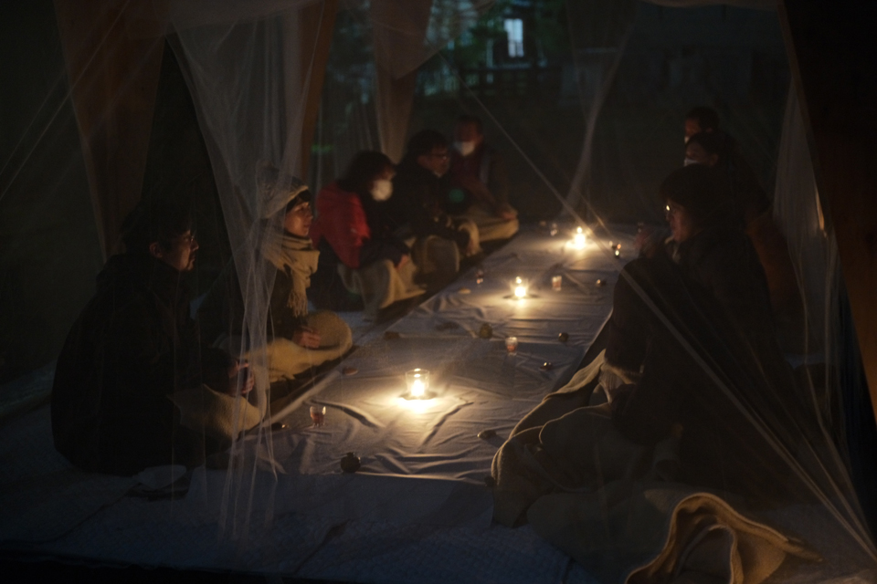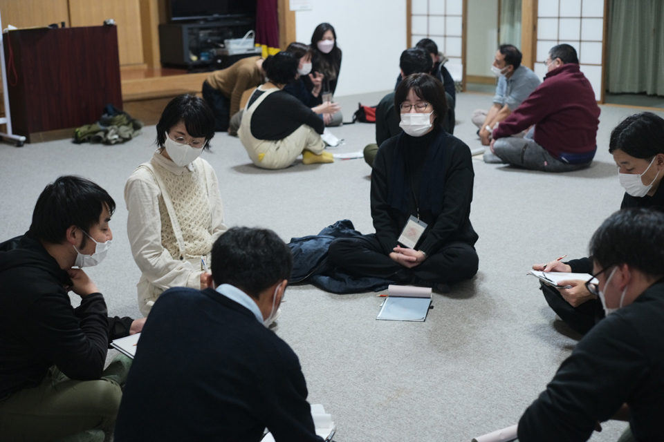 宿坊に戻り、大広間に集合。各自しおりをシェアして、一日分を振り返ります。「普段使わない筋肉を使ったようで、心地よい疲労感がある」「自分がいかに普段、視覚を頼りに生きているかがわかった」「通っている学校の近くに川が流れているが、川という記号でしか認識していなかった。水のワークで、川の音にも種類があると気づいた。」「(食事のとき)見えないストレスが強くある一方、見えないことを楽しむ自分もいた」「どんどんと感覚が開いてきて、最後は月と会話しそうになった(笑)」などなど。