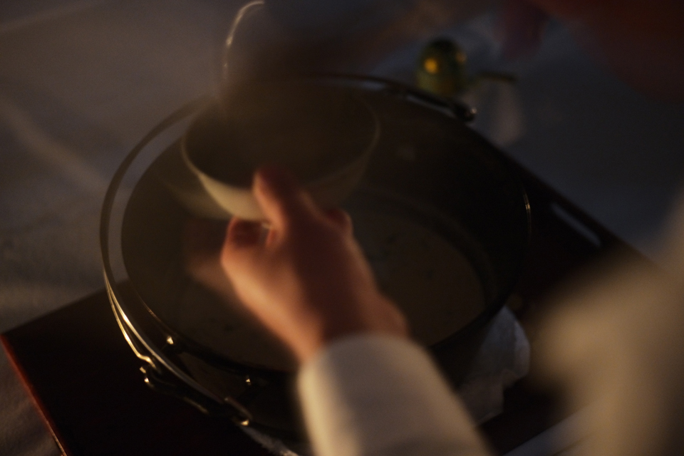 手元に配られたのは、おそらく色々な食材が並べられたお皿とお鍋のようなもの。わずかなロウソクの光を頼りに目をこらすと、お皿の横に大きなハマグリの貝殻が。これを使って食べるのだ、と気づきます。