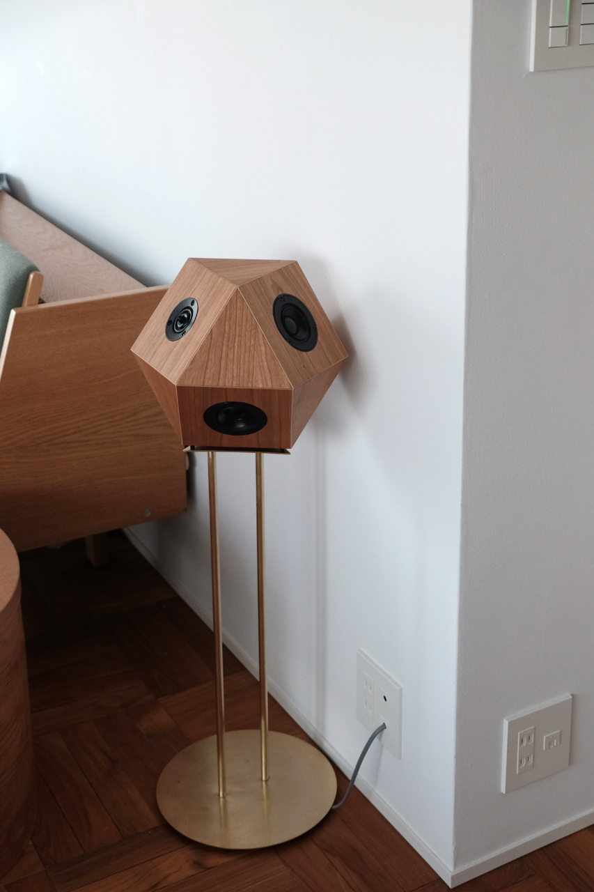 家族が集まるリビングダイニングに、一台は吊り、もう一台はスタンド置きでの配置です。真鍮製のオリジナルスタンドは、足がパイプ状になっており、スピーカーケーブルを通せる仕様。足元もスッキリです。