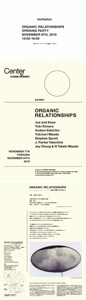 その前田さん率いる“COSMIC WONDER”の注目の次回展覧会「ORGANIC RELATIONSHIPS -反復 反響する次世代へ-」が東京青山のCenter for COSMIC WONDERで行われます。