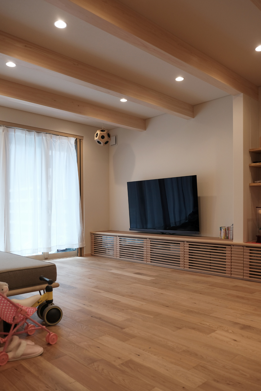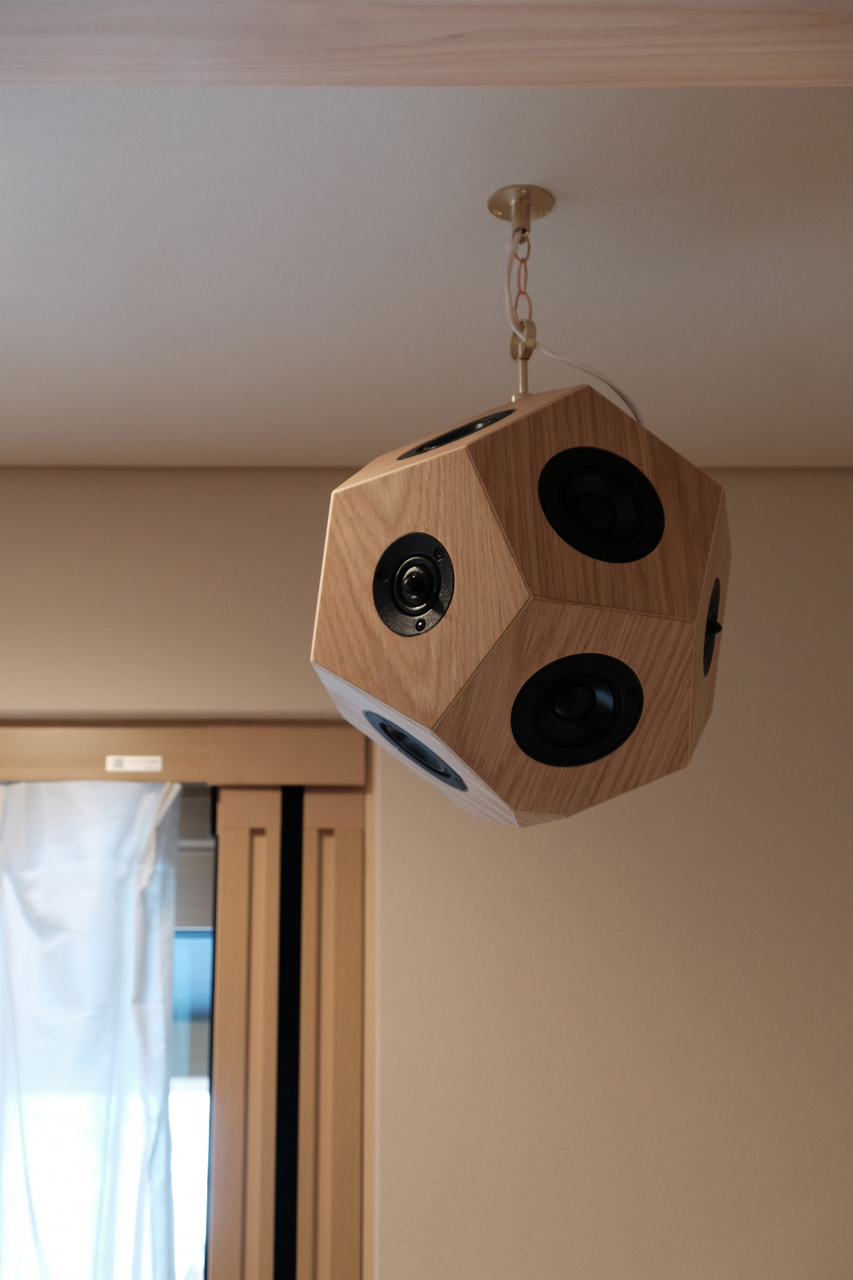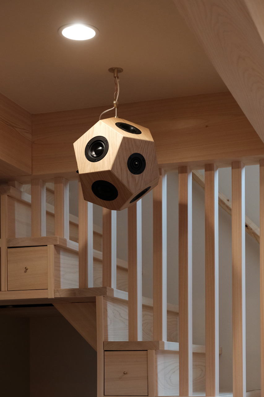 京都の新築A邸に12面体スピーカー”scenery“を納入いたしました。天井、床、家具までたっぷりと木を使った素材感のある内装に、ホワイトオークの色味や木目が自然に馴染みます。設計段階から設置場所を決めていたので、スピーカーケーブルも壁内配線でスッキリ。新築ですが、ほどよく木が吸音し、無駄な響きもなくすっきり音がまとまりました。