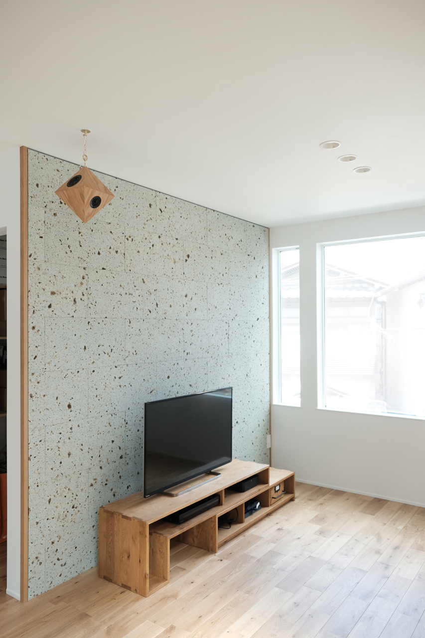 リビングの壁面は、吸音性に優れ、音響効果があることで知られている大谷石。そのせいか、新築にも関わらず余分な響きもなくすっきりと音がまとまりました。ホワイトオーク仕上げの色味も大谷石にピッタリです。