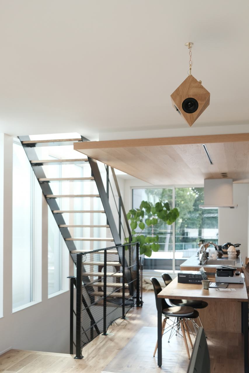 大阪の新築I邸に8面体スピーカー”vision“を納入いたしました。listudeのスピーカーは無指向性なので、必ずしもTVの両サイドに配置しなくても構いません。片方が前、片方が後ろにあっても、空間全体を響かせるため違和感はありません。ここでもリビングの対角に配置しましたが、LDKがつながった空間なのでダイニングキッチンにいても十分に音が聴こえます。吹き抜け階段なので、1階や3階にも心地よく広がります。