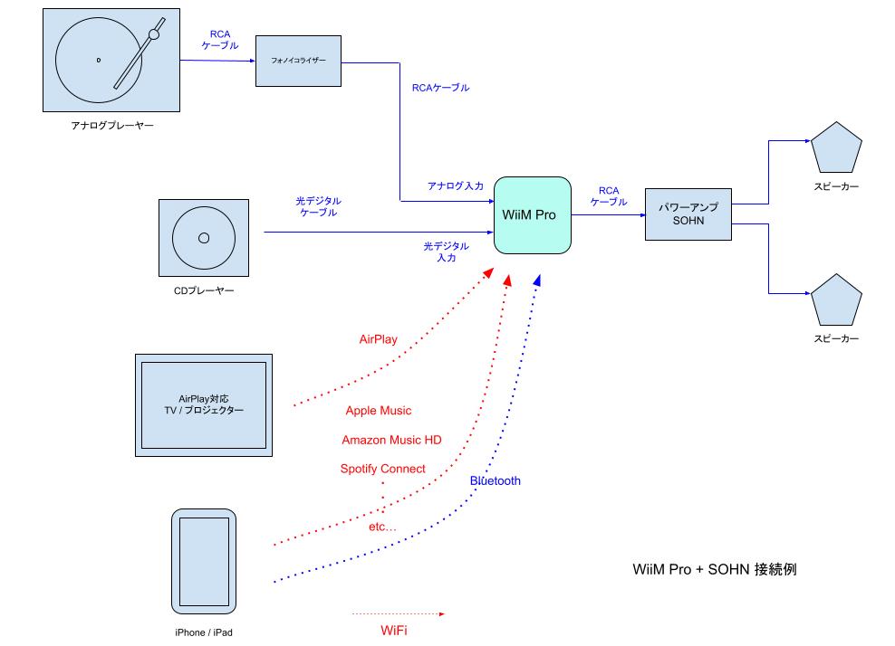 “WiiM Pro”は”SOHN”と組み合わせ、あらゆるサブスク音源、アナログ入力にレコード、デジタル入力にCD、あるいはテレビ音声など多様な音源をWiFi経由でスマートフォンからコントロールし手軽に聴くことができる機器です。”SOHN”とは付属のRCAケーブルをつなぐだけです。