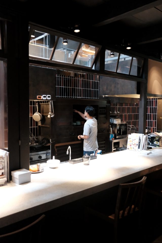 繁華街からもほど近く、それでいて静かな町屋が並ぶ、雰囲気ある通りの中にたたずむ店頭から一歩店内へ踏み入れると、歴史ある空間の広がりにタイムスリップしたかのような錯覚を覚えます。昔ながらの町屋を改装したという店内のところどころには、この家の歴史を感じることができ、見どころのひとつです。吹き抜けのキッチン、階段下、提灯をいれていたという化粧箱、キッチン内にある立派な棚など、京都ならではの暮らしに基づいた様々な工夫を活かしつつ新しい空間へと仕立て上げ、お料理だけではなく空間全体でお客様を楽しませてくれる雰囲気にとてもワクワクしました。