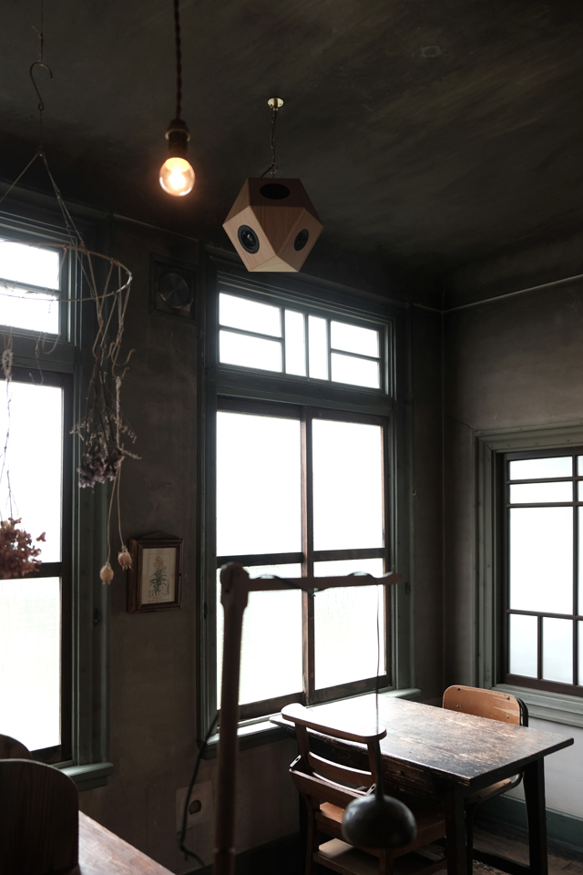 長野県喬木村にオープンしたカフェギャラリー「しろくま座」に14面体スピーカー”sight”を納入いたしました。築90年の古い洋館のような建物は元々は医院だったとのこと。所々に残る古い風合いが、新築にはない落ち着きと時間の流れを感じさせます。古いものが好きという店主によってコツコツと集められた古道具と、現代作家の作品が違和感なく馴染み、空間を優しく彩ります。