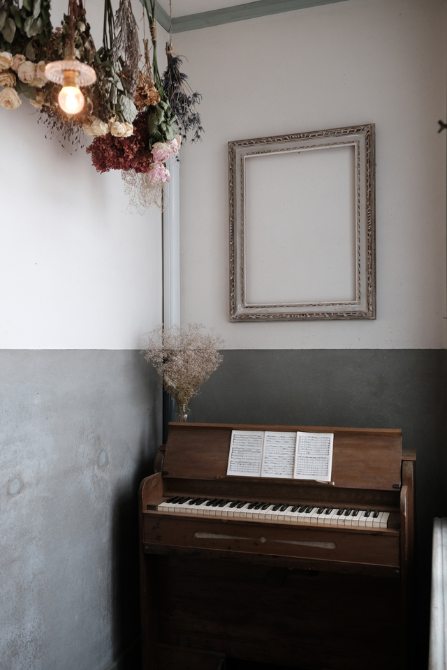 スピーカーはホワイトオーク仕上げ。凛と上品な佇まいが空間に溶け込みます。古い建物なので豊潤な響きが全体に広がり、小音量でも十分な解像度で音楽が耳に届きます。