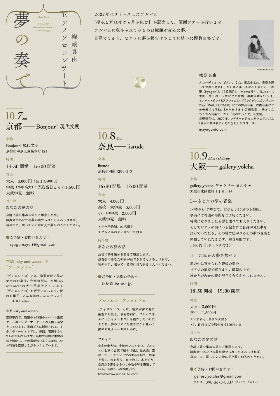 2022年にリリースした権頭真由ソロアルバム「夢みる耳は夜ごと月を包む」を記念して行われる2023年秋・関西ツアー、奈良公演はlistudeにて開催いたします。
