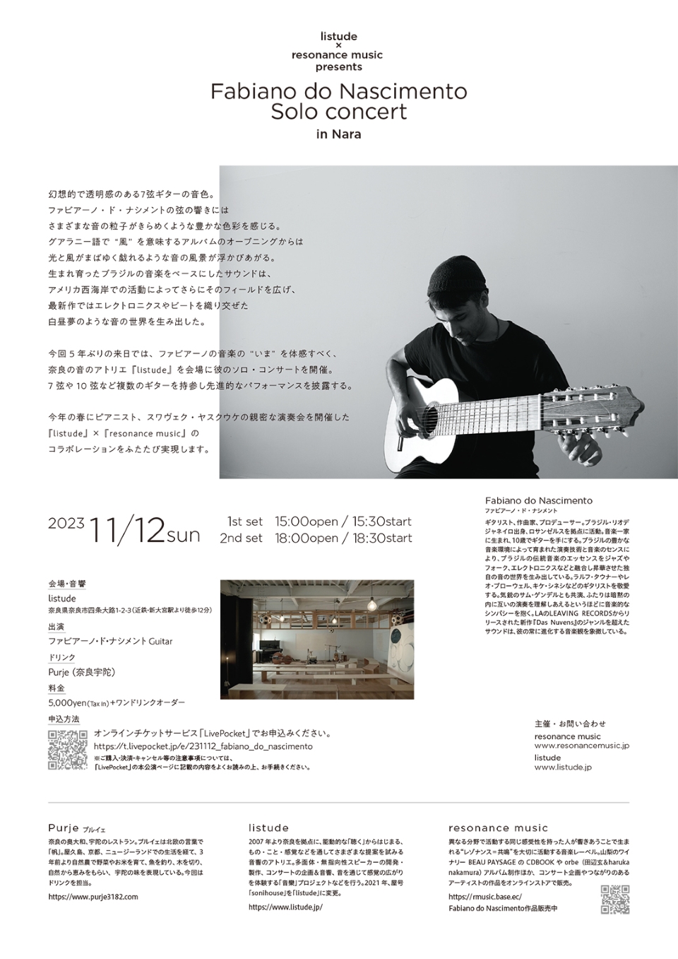 LAで活動するブラジル出身のギタリスト、ファビアーノ・ド・ナシメントのソロ・コンサートを2023年11月12日(日) 奈良『listude』にて開催します。