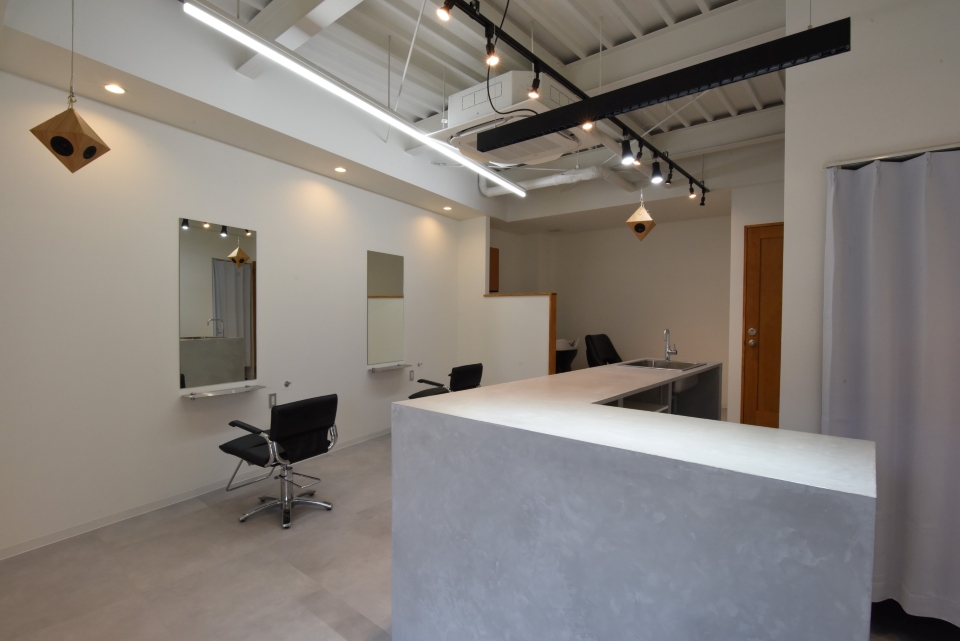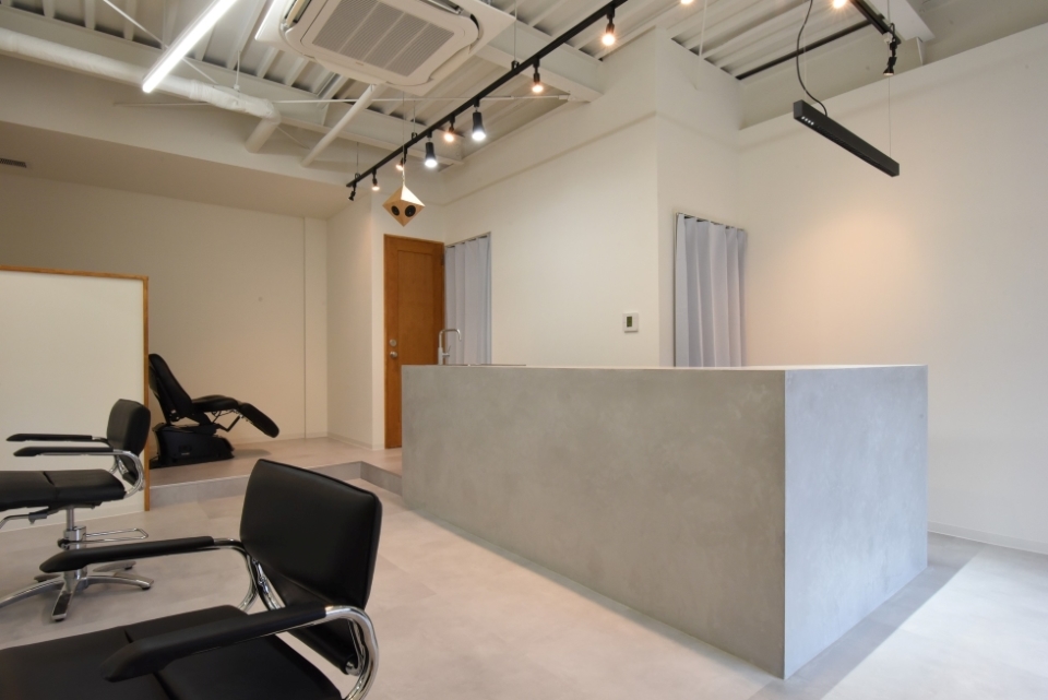 白い壁とコンクリートの風合い、ポイントで使われた黒の存在感が洗練されたサロンの雰囲気を際立たせ、店内に吊られた”vision”のホワイトオークや店内ドアなど、ポイントで使われている木材のあたたたかみが、安らぎの空間をも演出していて、居心地の良さが感じられる店内。
