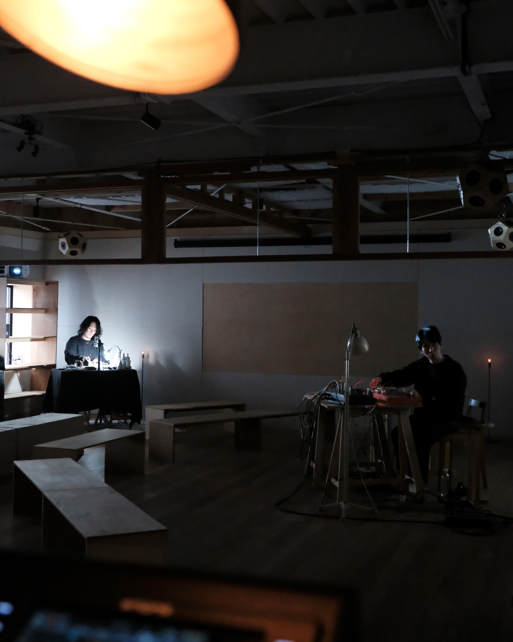 1部では、MAKOTOさんが卓上いっぱいのシンセサイザーを巧みに操り、VJのKeiji Matsuokaさんと共に行うライブ演奏を。休憩をはさんだ2部では、新リリースの「emolient」をライブ会場そのままに、listudeのスピーカーをはじめとした音響システムで聴く試聴会を行いました。