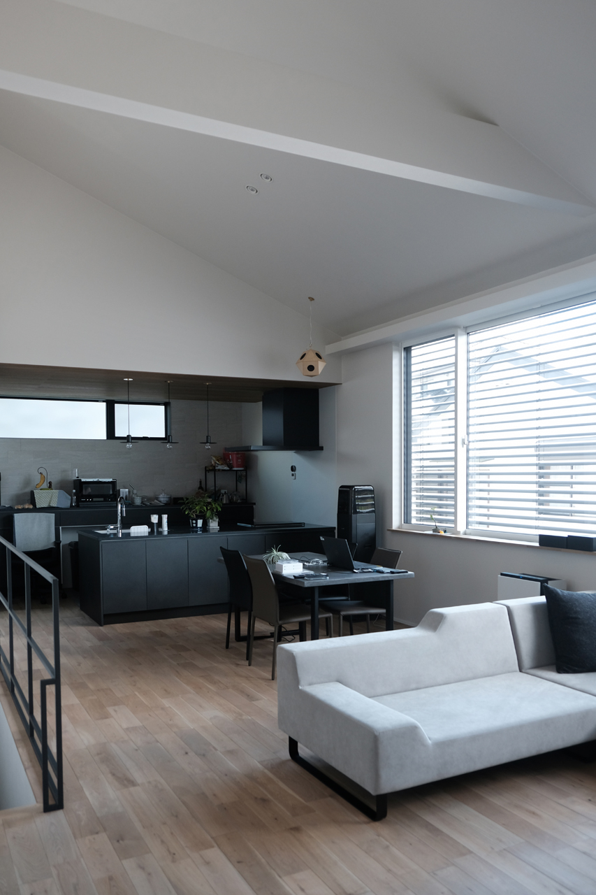 約25帖の広々としたLDK。その対角に吊り下げられたスピーカーから発した音は最高4mの傾斜天井を巡り、空間全体を包み込みます。試聴の為に流した女性ボーカルの歌声はどこまでも伸びやかで、その響きの豊かさから、部屋がさらに広くなったような感覚に。