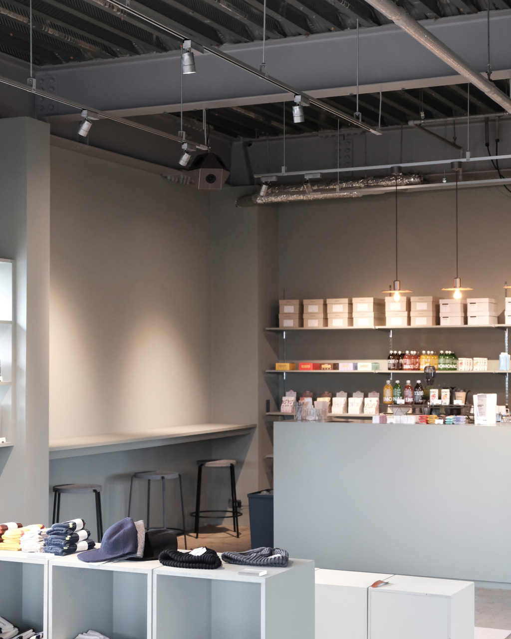 壁から什器にいたるまで、なんともいえない落ち着いた淡いグリーンで統一された内装に、コトグレーのアーシーな色味がピッタリはまります。緑の多い環境とも相反しない、ニューノスタルジックな空間に音楽がやさしく寄り添います。