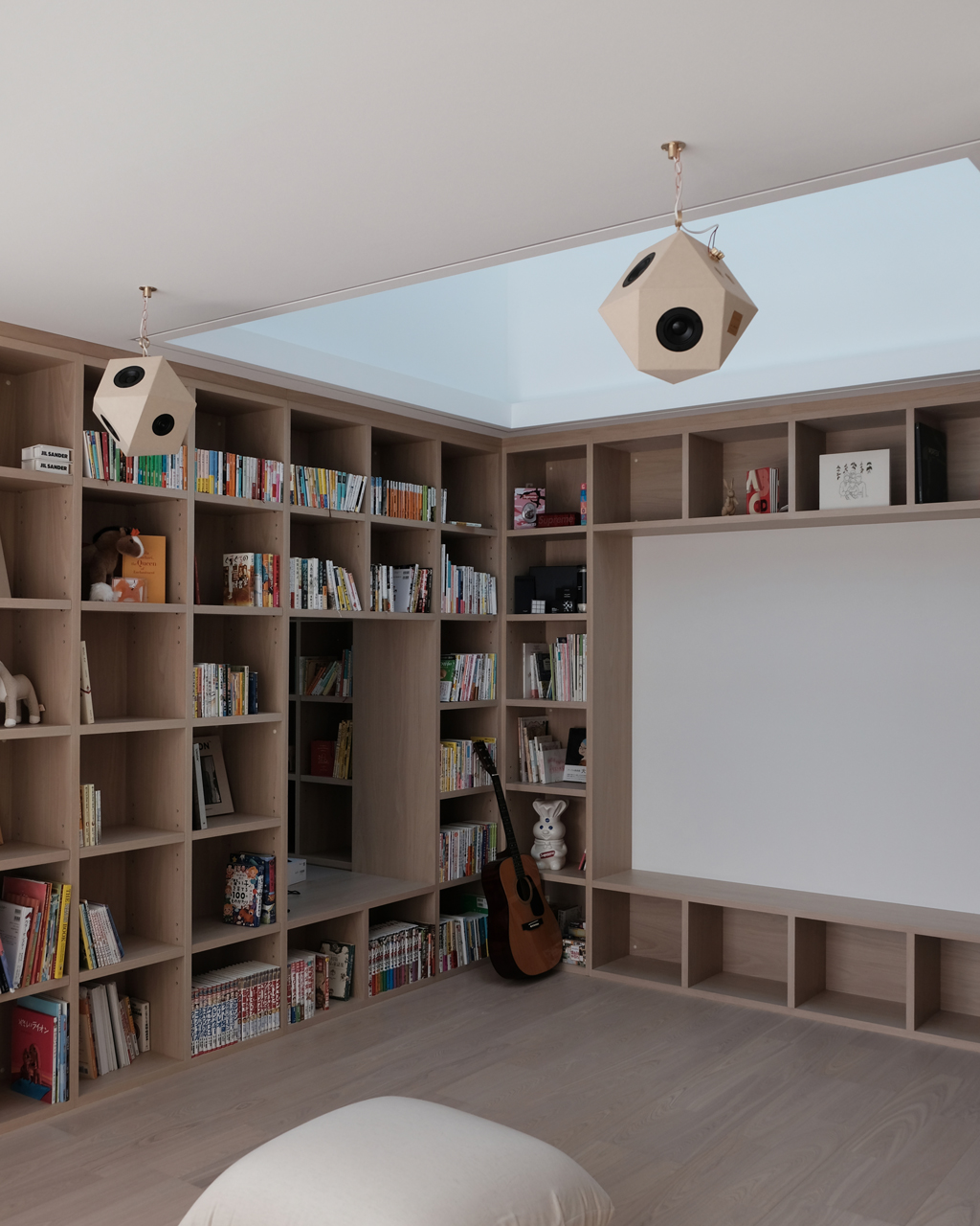 本棚の中には家族の様々な本がたくさん収納され、奥にはプロジェクタースクリーンも。スピーカーは、部屋の入口部分の2か所に直線上に設置させていただき、音楽を聴くときはもちろんのこと、プロジェクターで映像を観るときにもピッタリの配置になったと思います。