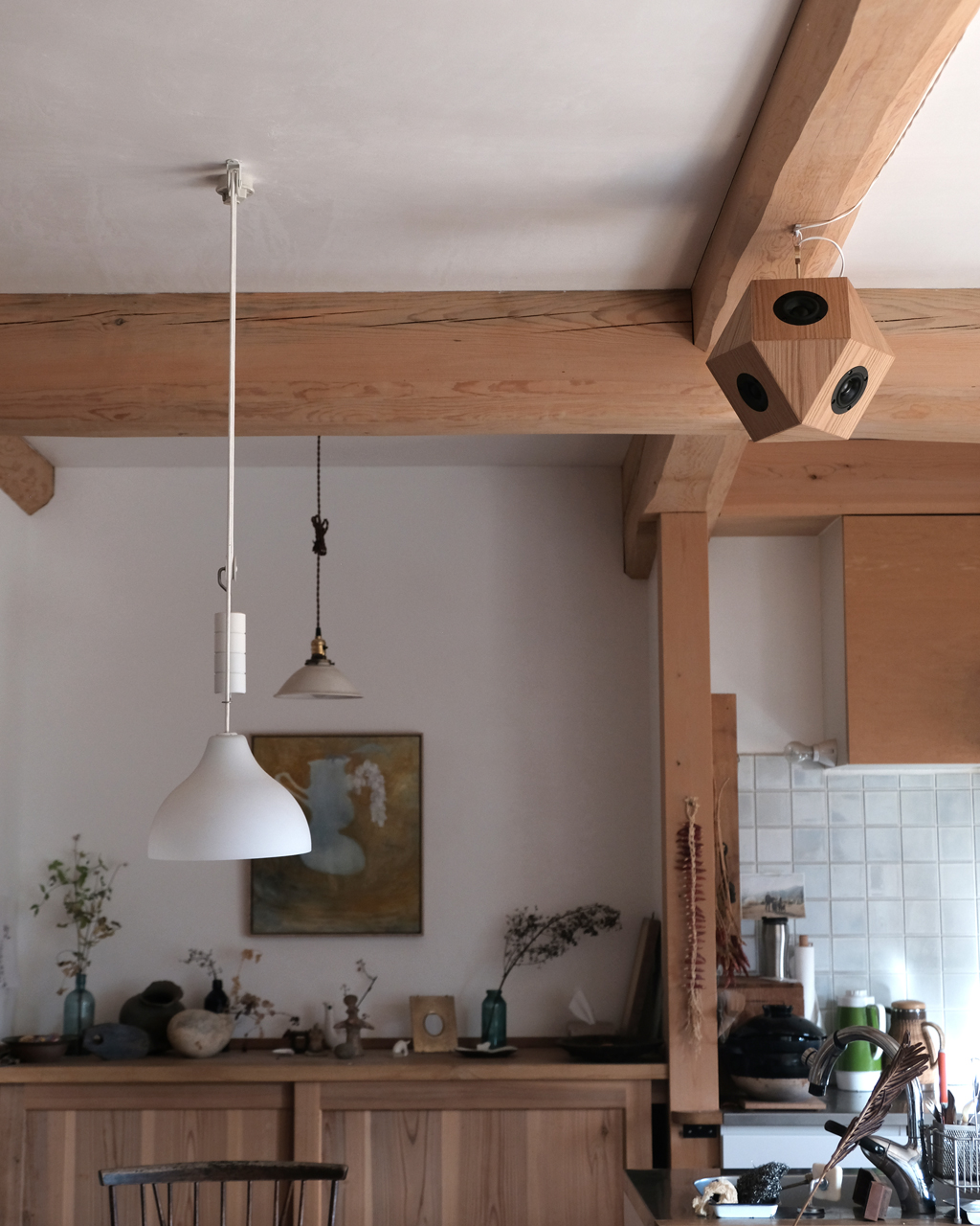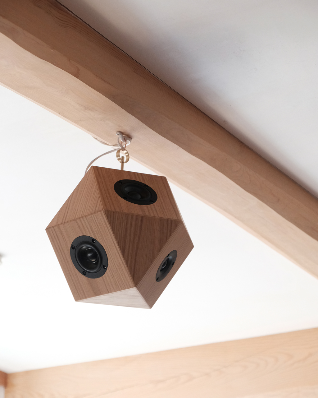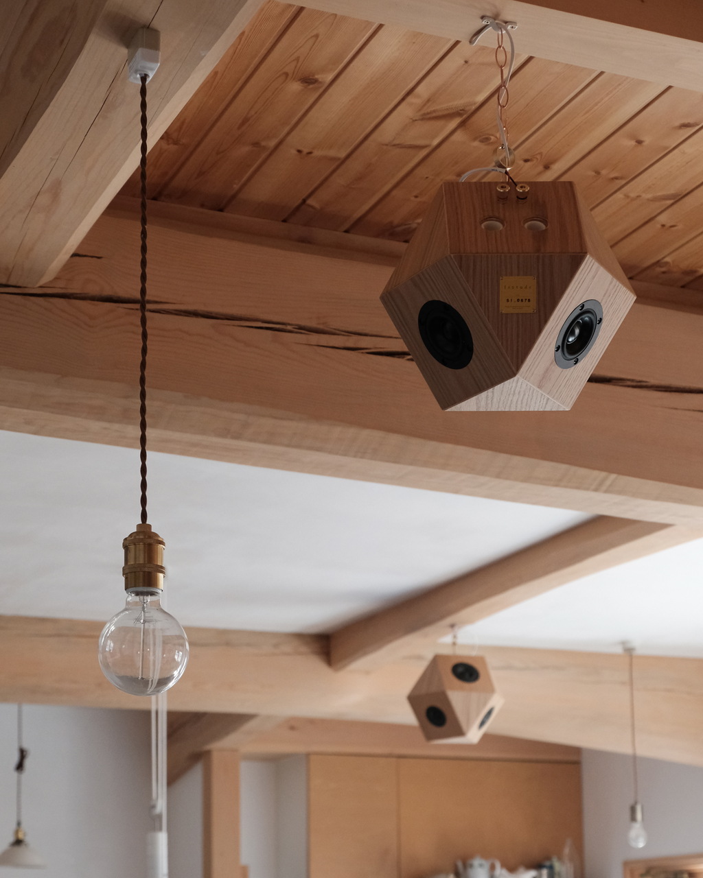 八ヶ岳の麓、長野県富士見の住宅T邸に14面体スピーカー”sight“を納入いたしました。今回はすでにお住まいの住宅だったので、お伺いした際にアンプの置き場所や生活動線をヒアリングし、スピーカーの設置場所を決定しました。コの字型になったLDK空間だったので、その全体に音が行き渡るような対角にて吊り下げました。