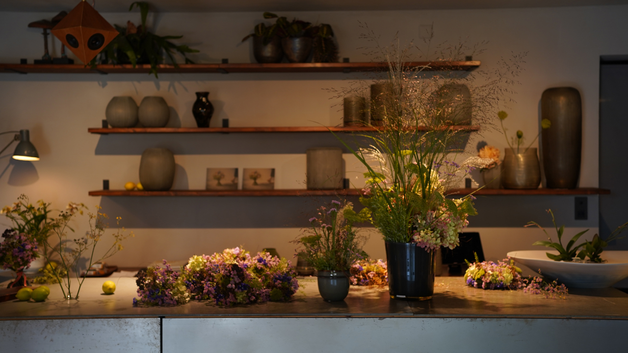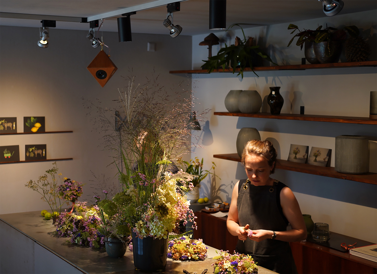花や植物のデザインやワークショップなども行われる店内で、アメリカン・ブラックチェリー仕上げの色が優しく馴染んでいます。奈良のアトリエで生まれたスピーカーが、遠く離れた地で空間に彩りを添えていることを想い、嬉しく思います。
