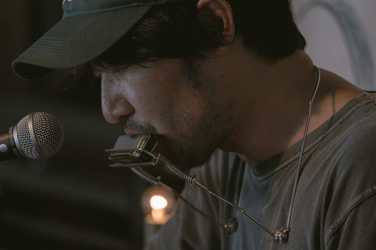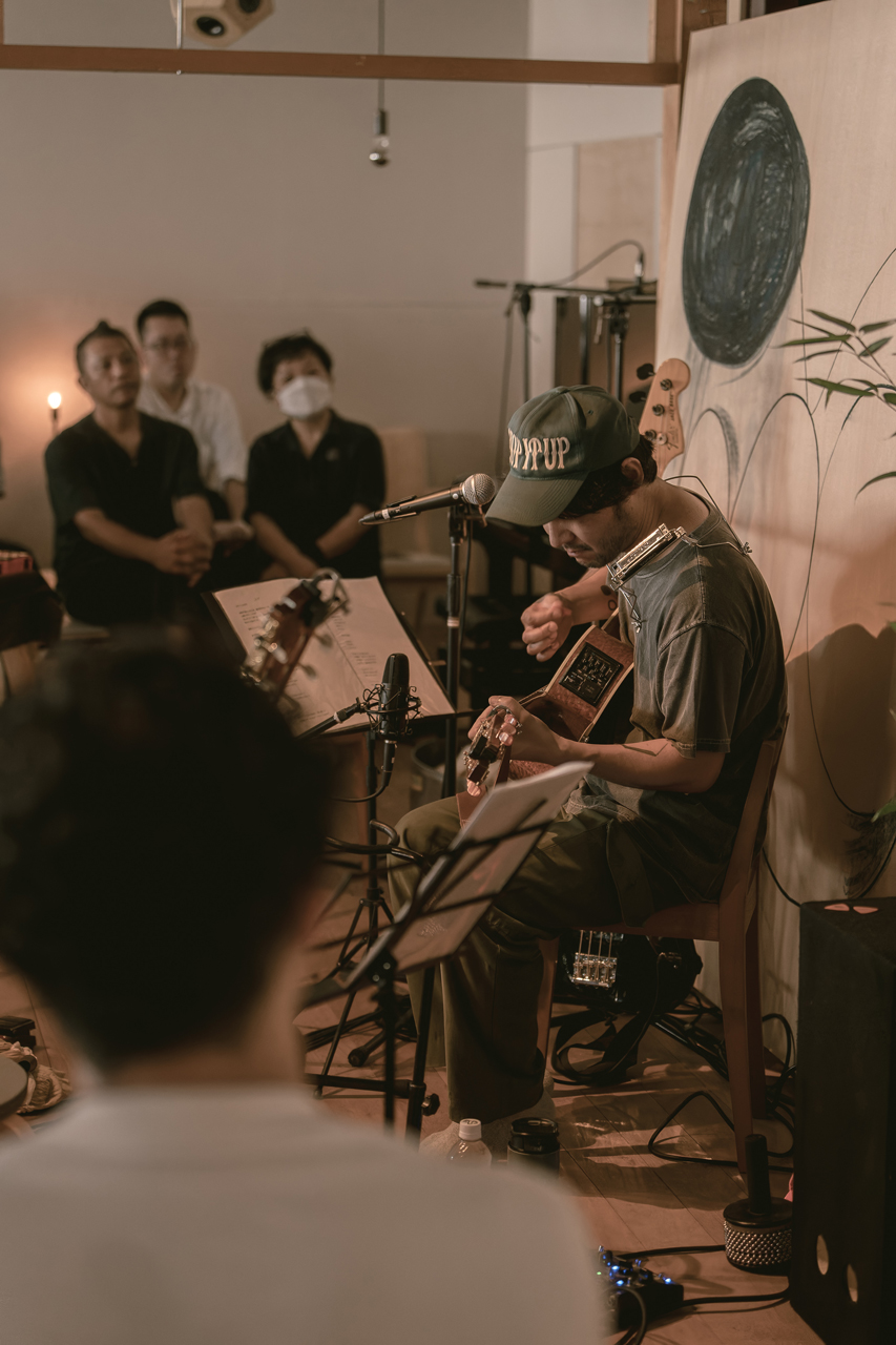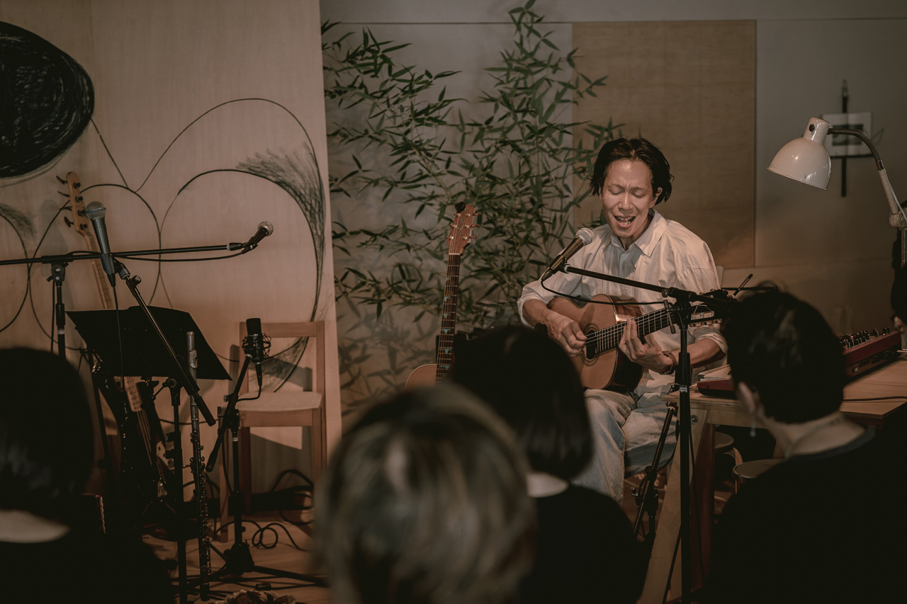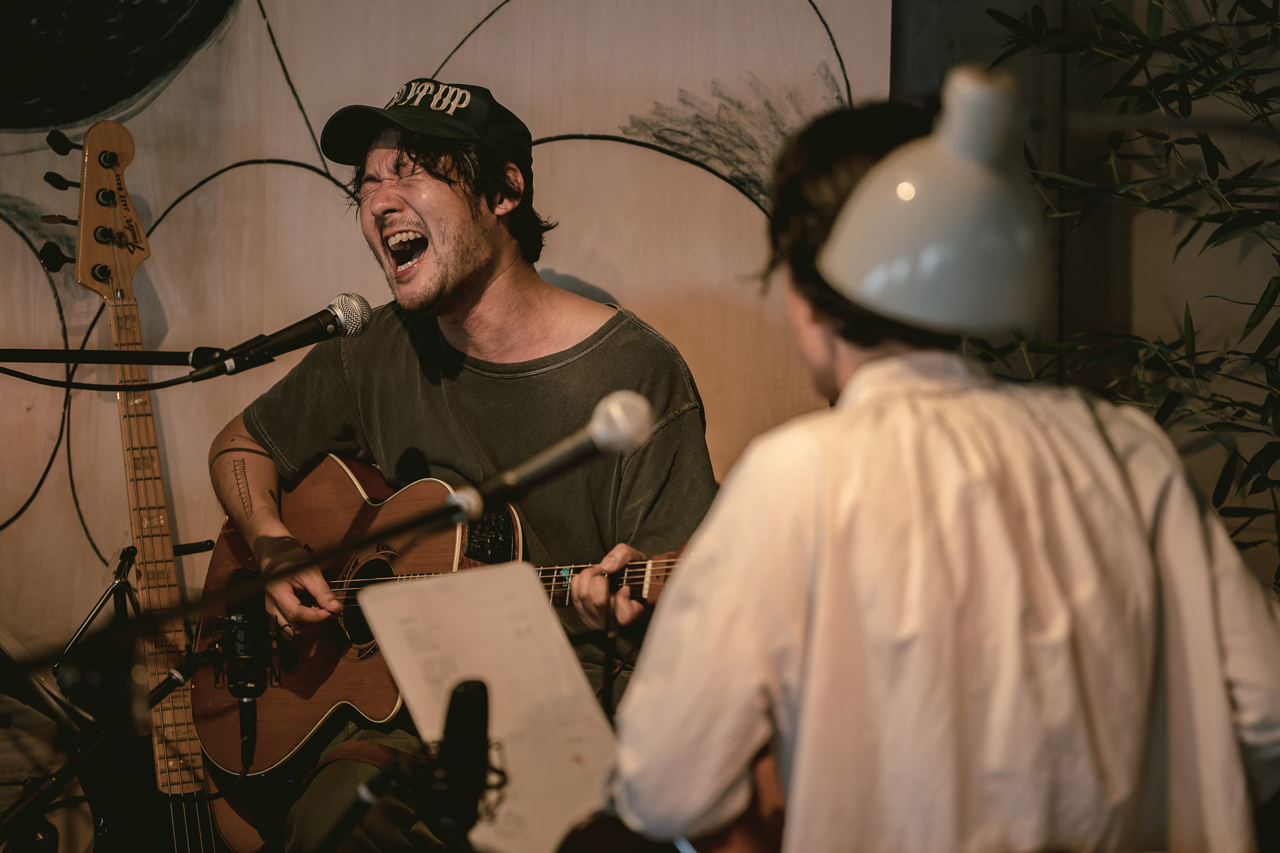 リハーサルを踏まえた本番当日。イベントは休憩を挟み、前半と後半に分けられ構成されました。前半は、五味さんのギター弾き語りから始まり、曽我さん、タイチさんとまずは3人各々のステージを演奏していきます。ギターをかき鳴らしながら、情感たっぷりに歌い上げる五味さん。