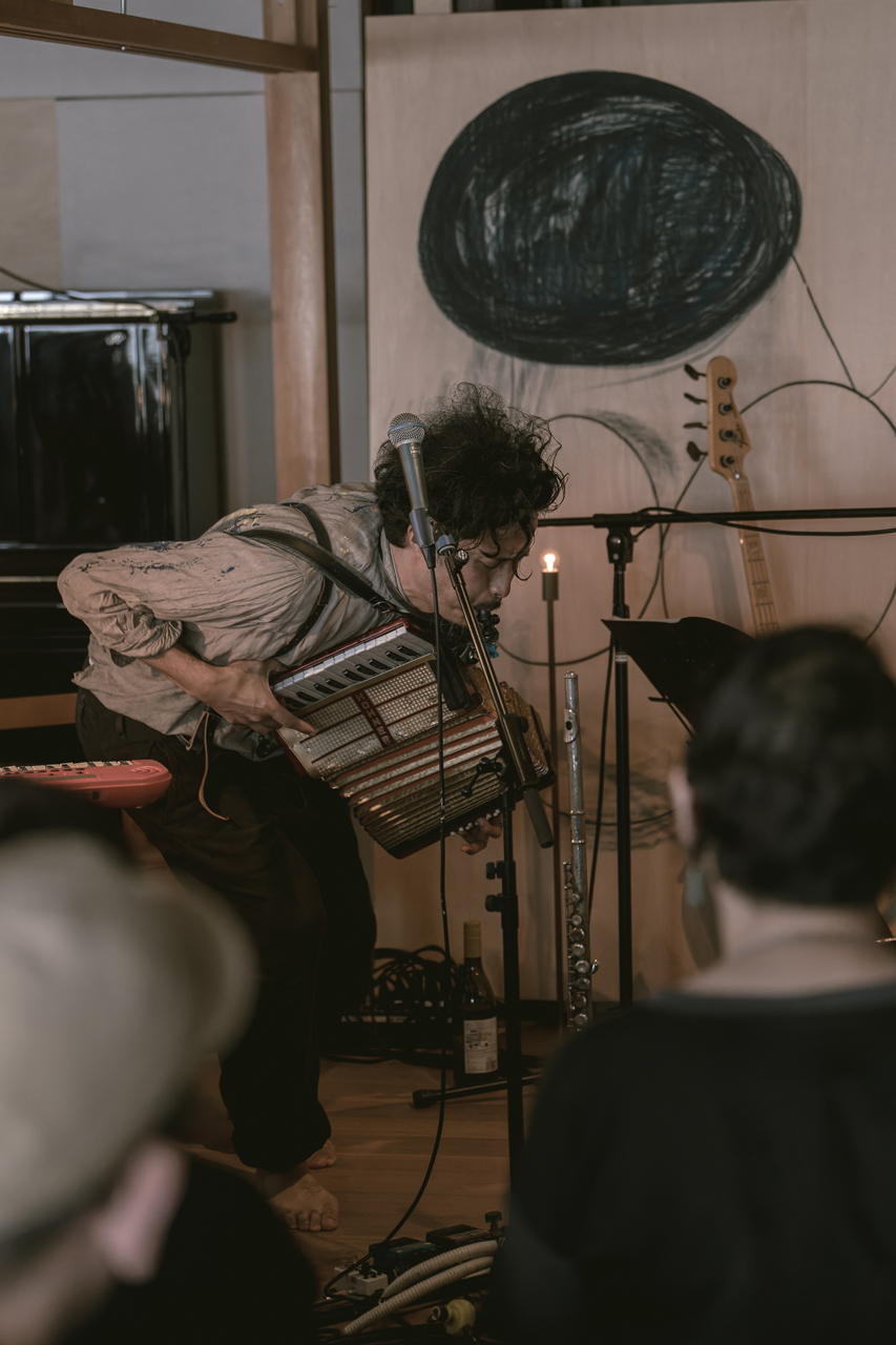 別れの切なさと、3人の見たこともない神々しく荒々しいセッションと、会場中の色々な感情が音やパフォーマンスとなり、入り混じって見たことも聴いたことも体験したこともない濃厚な3時間を、嵐のように駆け抜け終わったエンディングテーマには、清々しい余韻を感じました。超満席となった70名の熱気はとてつもなく熱くて、全員汗を滴らせながら手を握りしめ、音に、空気に、夢中でステージを観続けたことと思います。