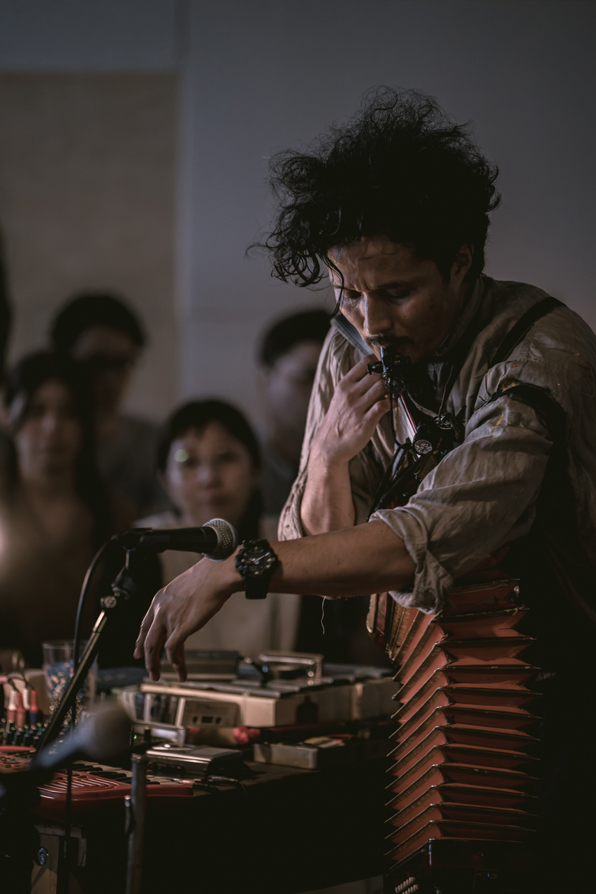 テーブル一杯に置かれたあらゆる楽器たちを巧みに操りながら、まるで映画を観ているように音を重ねていく曽我さん。