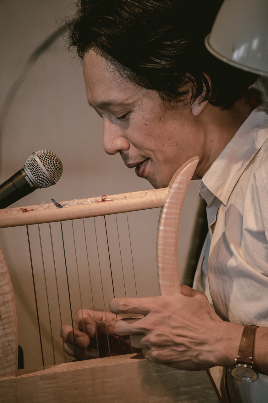 セッションは次第に大きくなり、気がついたらタイチさんは大きな笹を両手にそれらを振り音を奏でていて、曽我さんは連なった布たちをタイチさんに被せたり、会場内に縦横無尽に張り巡らせたり、五味さんは変わらずずっと真剣な表情でベースを弾き続けていたりと、カオスな状況に。即興的に作り出される音楽は、3人がお互いを見合いながら呼吸をあわせ奏でられていて、その予定調和にはないギリギリの精神力と集中力に、会場中の熱気もさらに高まり、まるで熱に浮かされているかのような、夢のようなひとときとなりました。