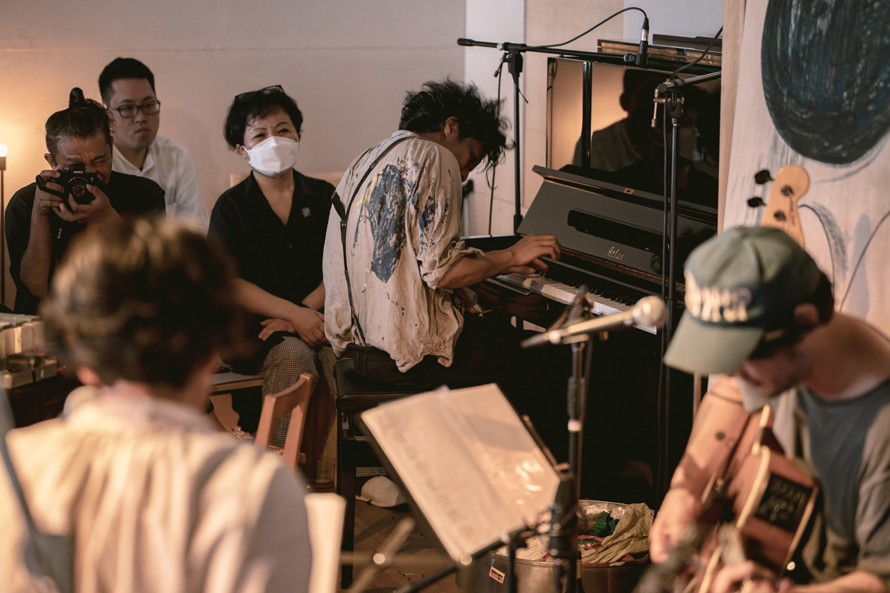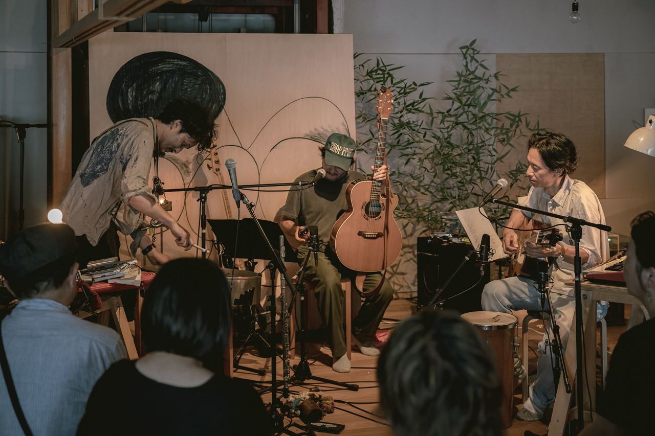 3人で演奏を行うことも初めて、五味さんに至ってはバンド以外でのセッションが初めてということで、方向性も含め2日前にはlistudeにて打ち合わせも兼ねたリハーサルが行われました。それぞれが持ち寄った楽器や音楽性などを用いながら「こんな風にしていこう」などセッションを重ね、本イベントのテーマである「エンディングテーマ」を模索していく様子は、なかなか見ることができない音楽のはじまりを目撃してしまったように思い、これから何が始まるんだろう、と胸の高鳴りを抑えることができませんでした。