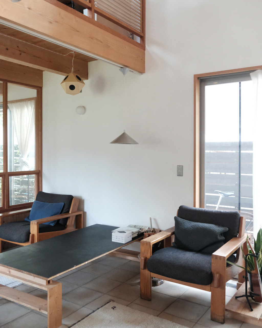 玄関を入るとLDKと吹き抜けがゆるやかに繋がる空間。部屋のどこが主役というわけではない一家の暮らしに寄り添えるよう、2台の吊り下げ場所を検討します。家でお仕事をされる時間も長いとのことで、朝から夜まで一日を通してBGMが家を包むように。またある時はソファに深く腰掛けて音楽を鑑賞できるように。
