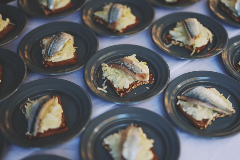 ◎ete[秋刀魚とじゃが芋タルティーヌ]:軽くマリネした秋刀魚、マッシュポテト、フェンネル、フレッシュハーブ、甘酸っぱいキウイソースを薄くスライスしたライ麦トーストの上に乗せたオープンサンド。