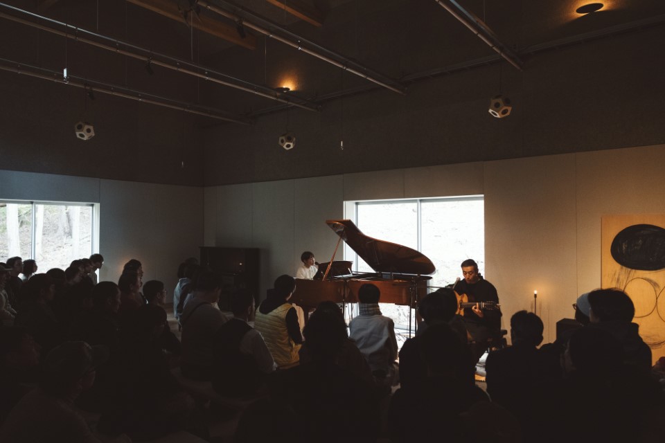 快晴の正午、外のステージに静かにあらわれたのは音楽家・田辺玄さんと森ゆにさん。2人はlistudeにとっても欠かせない存在で、この地に引っ越してくる理由のひとつでもあります。