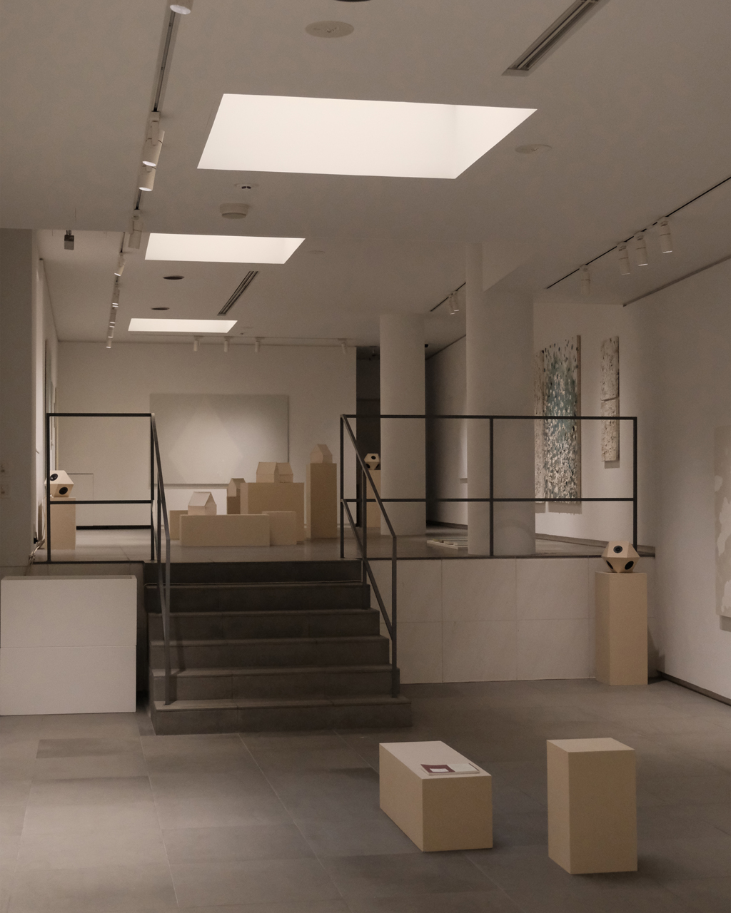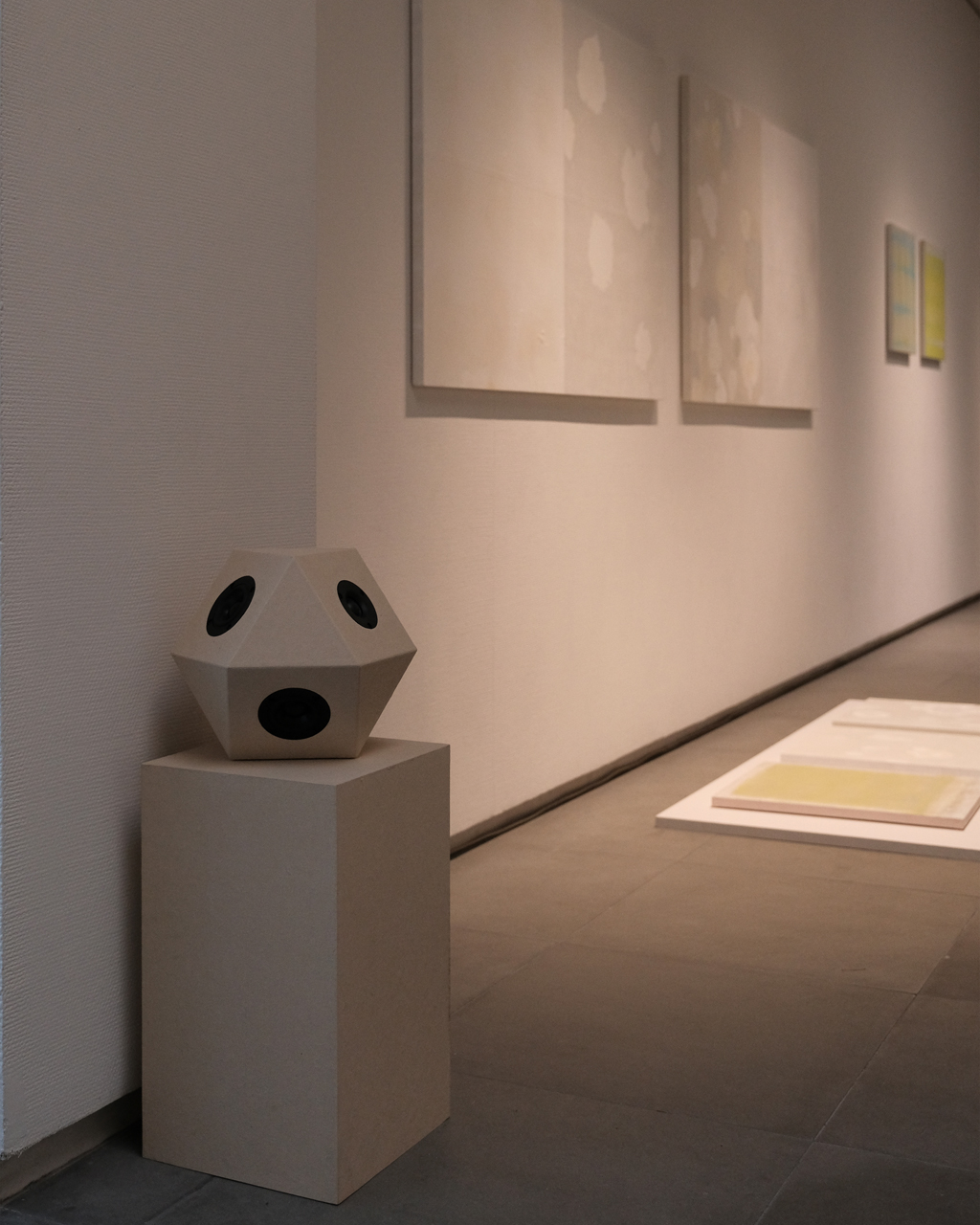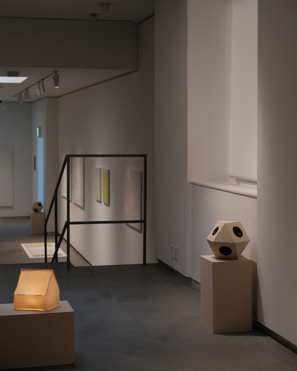 展示に使用された14面体スピーカー”sight”も、ハタノ氏による特注の和紙仕上げ。設備として空間に置かれているという印象はほとんどなく、まるで工芸品のように作品の列に静かに並び、展示の風景の中に溶け込んでいました。
