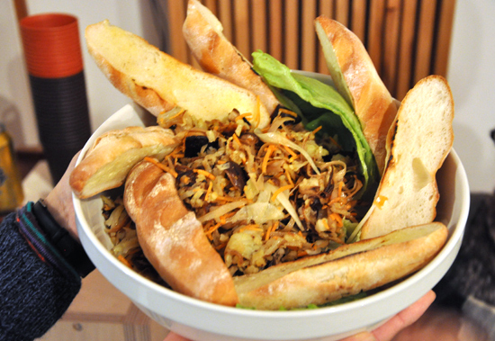 そしてキノコ類のサラダ。バケットに乗せて食べると、キノコのだしがパンのバターとじわ〜っと合わさり絶妙な旨さ。