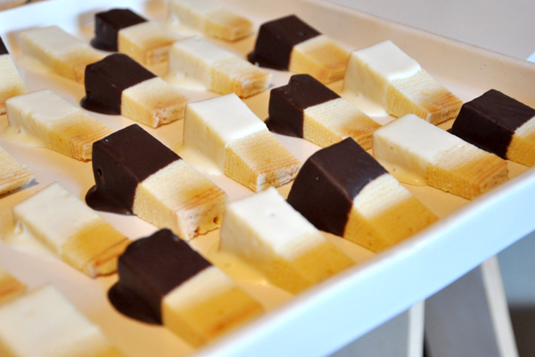 特別仕様のチョコがけバウムクーヘン!まさに年輪のような綺麗な切り口、白と黒が整然と並ぶ姿はなんと美しいこと!