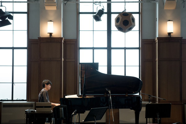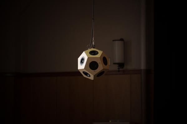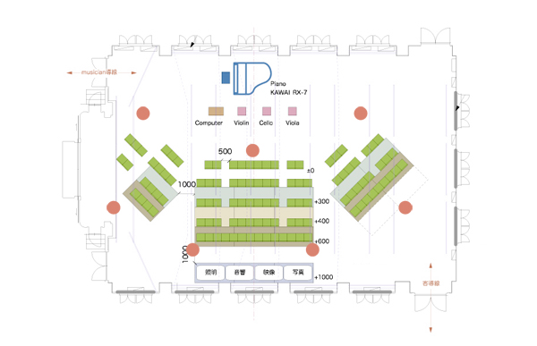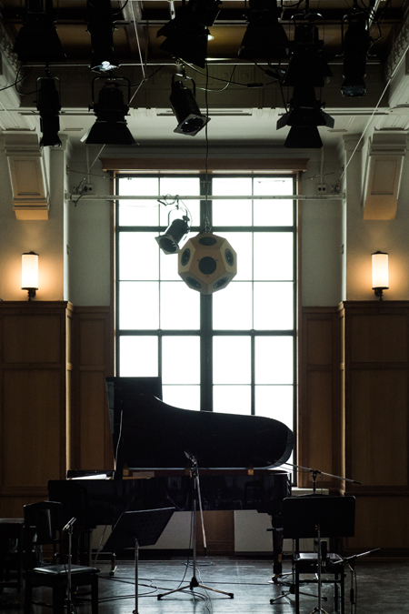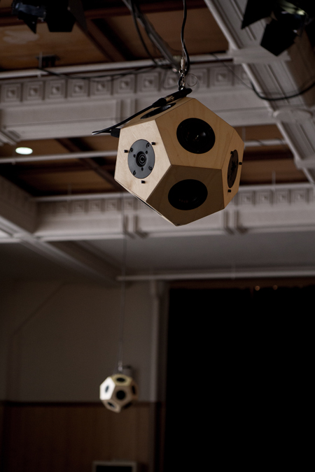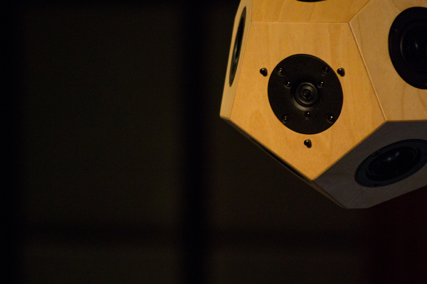 楽器の響きが自然に隅々まで拡がるよう、演奏者を中心にした扇形に7台の12面体スピーカーを配しました。