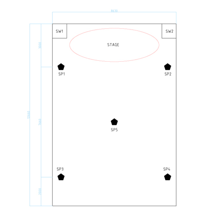 キーボードからの音を中央のスピーカーから出し、まわりの4つのスピーカーに拡げるよう構成しました。