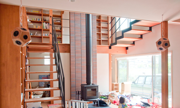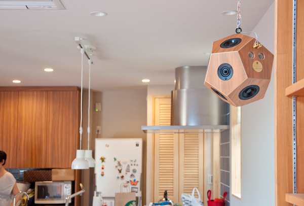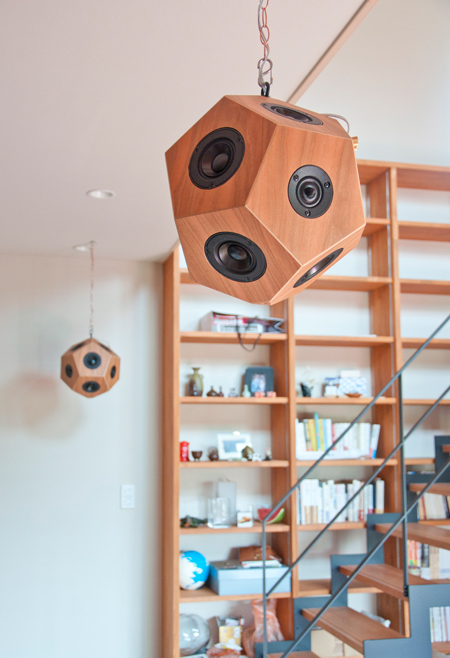 その憩いの中心となる暖炉を正面にして、左右に12面体スピーカー”scenery“を吊り下げました。